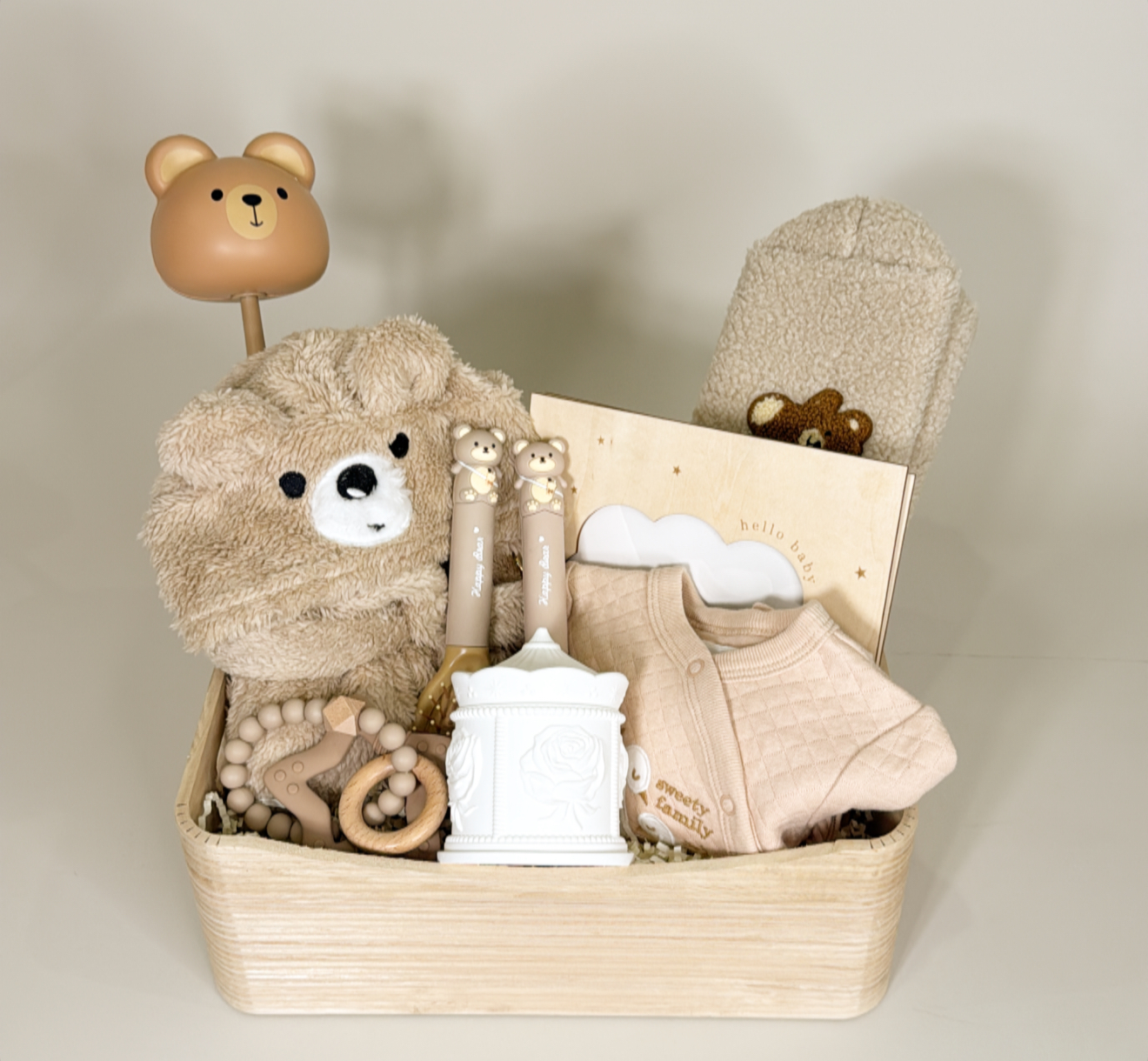 لحاف بيبي .روب بيبي بقبعه .افرول بيبي .علبه جوكلت بلجيكي .٢ عضاضه .ألبوم صور بيبي .٢ مشط .حقيبه مستلزمات شخصيه .سله قابله لاعاده الاستخدام .شعار اكرليك حسب المناسبه .كيس وكرت اهداء خاص بالمناسبه .تصل لاحبابكم مغلفه بالتور المعطر .