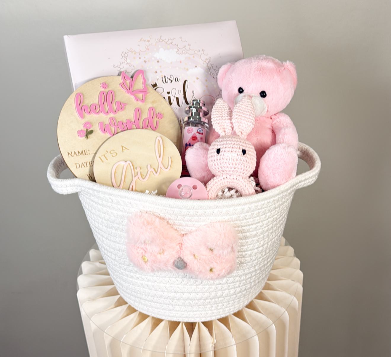 ألبوم صور لذكريات المولوده .لهايه .لوح خشبي لذكريات المولوده .لوح خشبي بعباره it’s A Girl .دميه قطنيه .مصاصه .عطر بيبي .سله قابله لاعاده الاستخدام .شعار اكرليك حسب المناسبه .كيس وكرت اهداء خاص بالمناسبه .تصل لاحبابكم مغلفه بالتور المعطر .