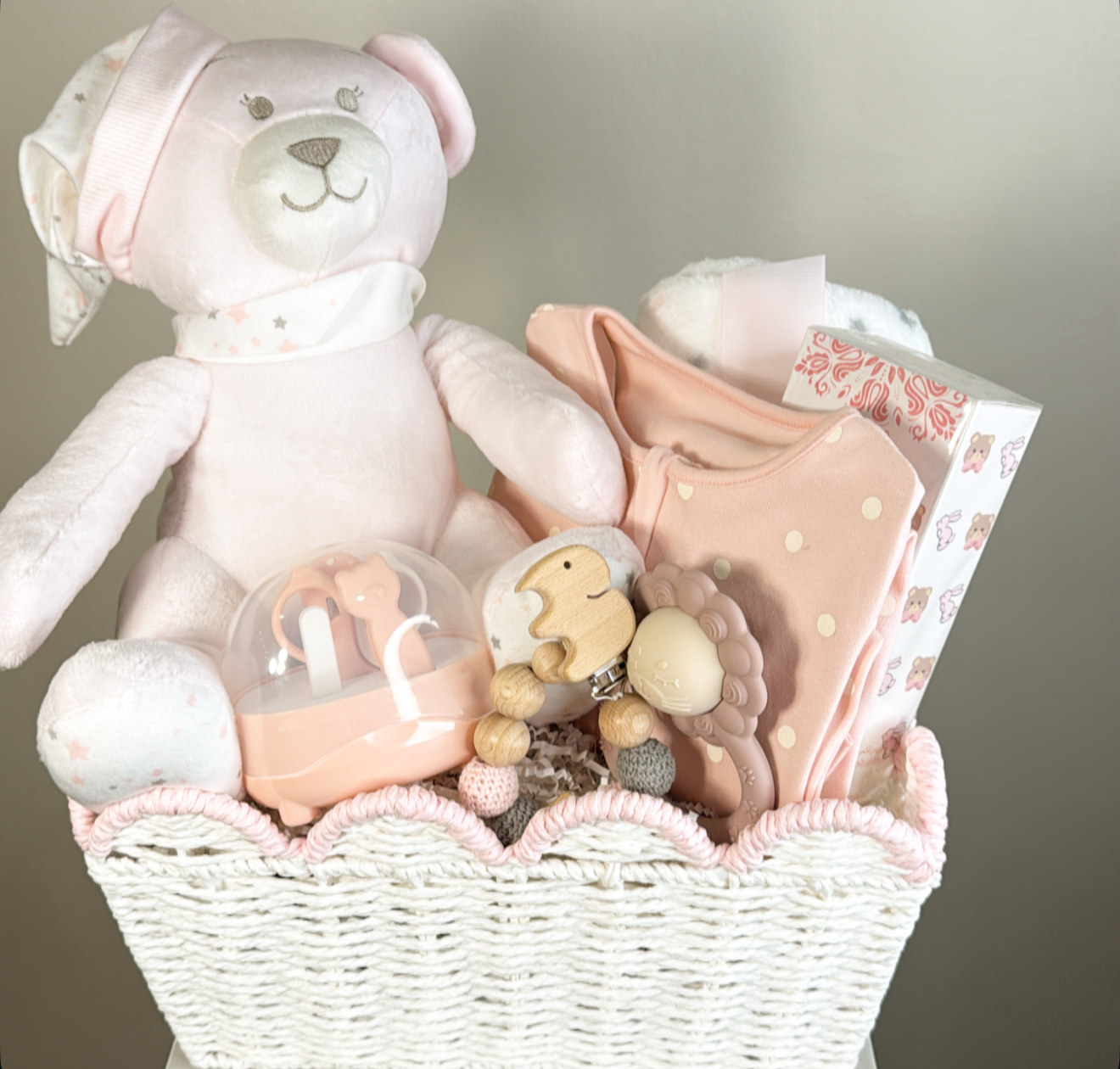 دميه قطنيه .افرول بيبي .لحاف بيبي .عطر مسك الكرز للاطفال .عضاضة .تعليقه للمصاصه .ادوات تقليم الاظافر .سله قابله لاعاده الاستخدام .شعار اكرليك حسب المناسبة .كيس وكرت اهداء خاص بالمناسبه .تصل لاحبابكم مغلفه بالنور المعطر .