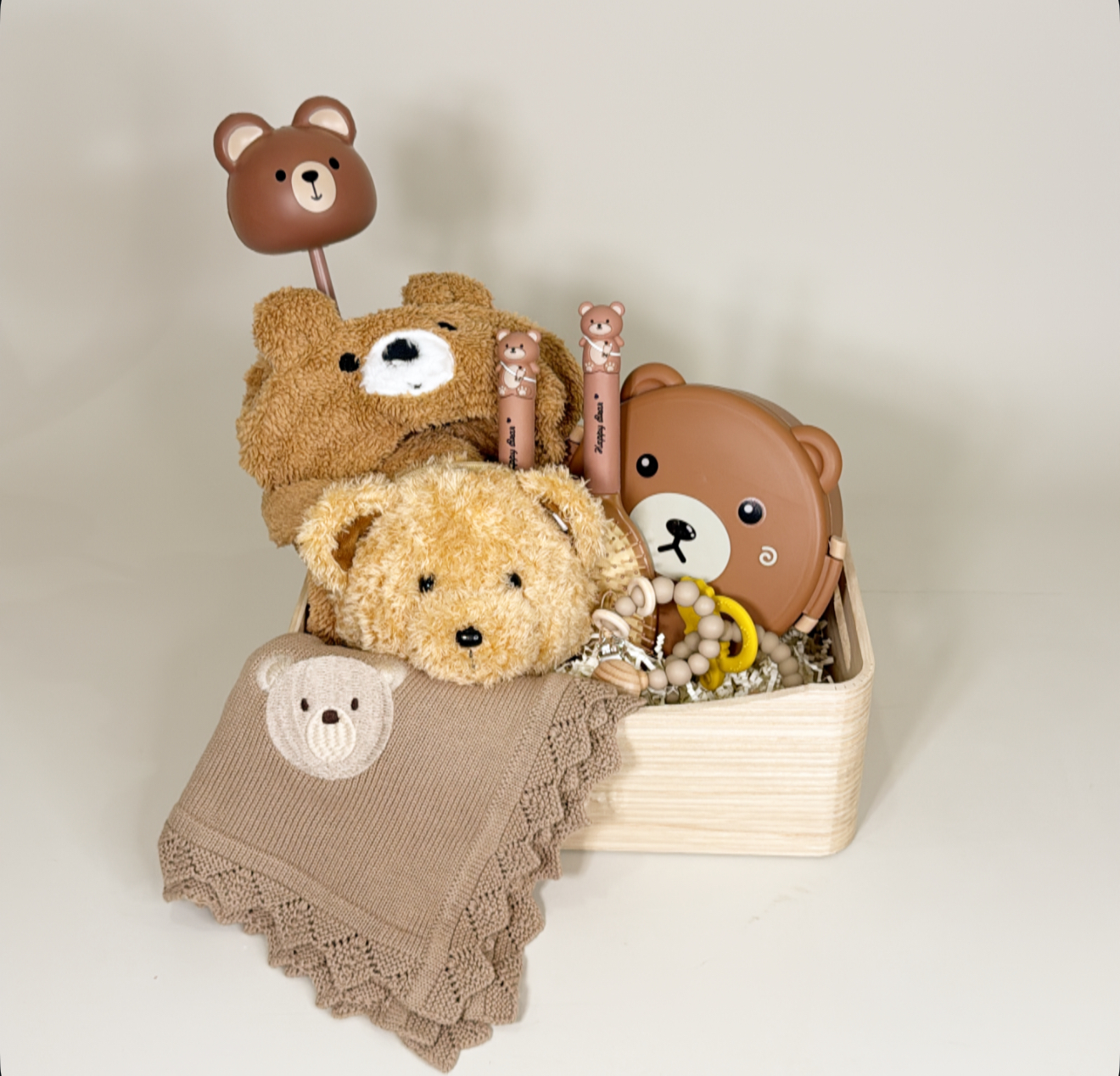 لحاف بيبي .روب بيبي بقبعه .علبه حفظ الطعام .٢ عضاضه .تعليقه للمصاصه .٢ مشط .حقيبه مستلزمات شخصيه .سله قابله لاعاده الاستخدام .شعار اكرليك حسب المناسبه .كيس وكرت اهداء خاص بالمناسبه .تصل لاحبابكم مغلفه بالتور المعطر .