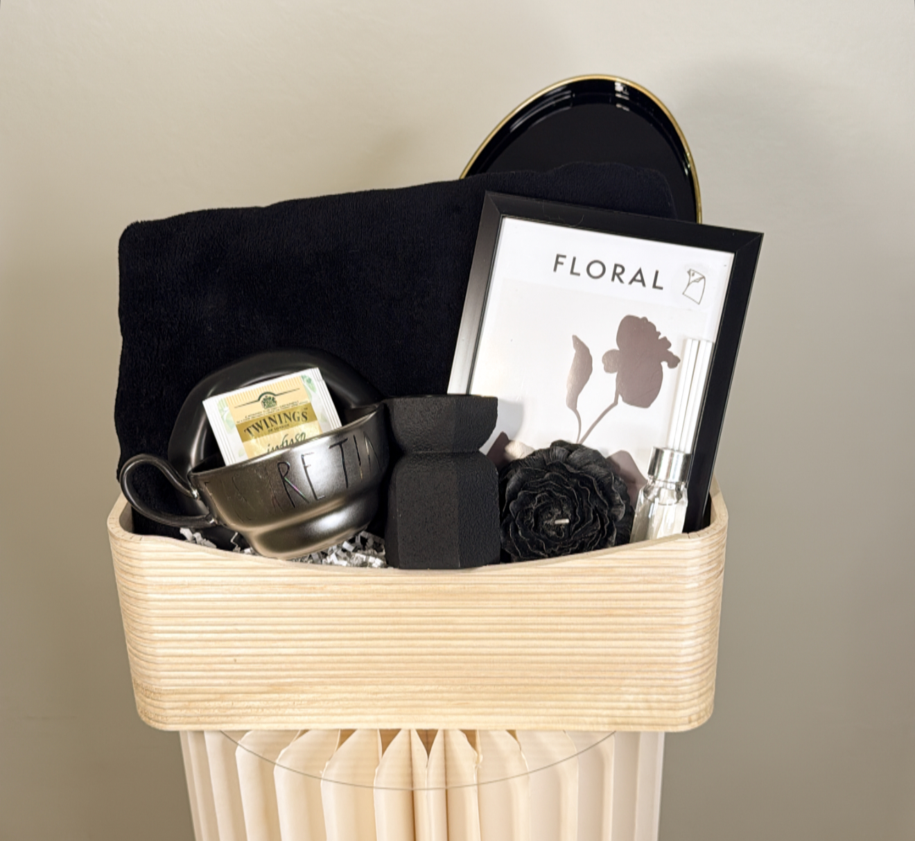 لحاف .صنيه تقديم .دفيوزر معطر للجو .لوحه .مبخر .شمعه معطره .كوب بصحن مع شاي استرخاء .سله خشبيه قابله لاعاده الاستخدام .شعار اكرليك حسب المناسبة .كيس وكرت اهداء خاص بالمناسبه .تصل لاحبابكم مغلفه بالتور المعطر .