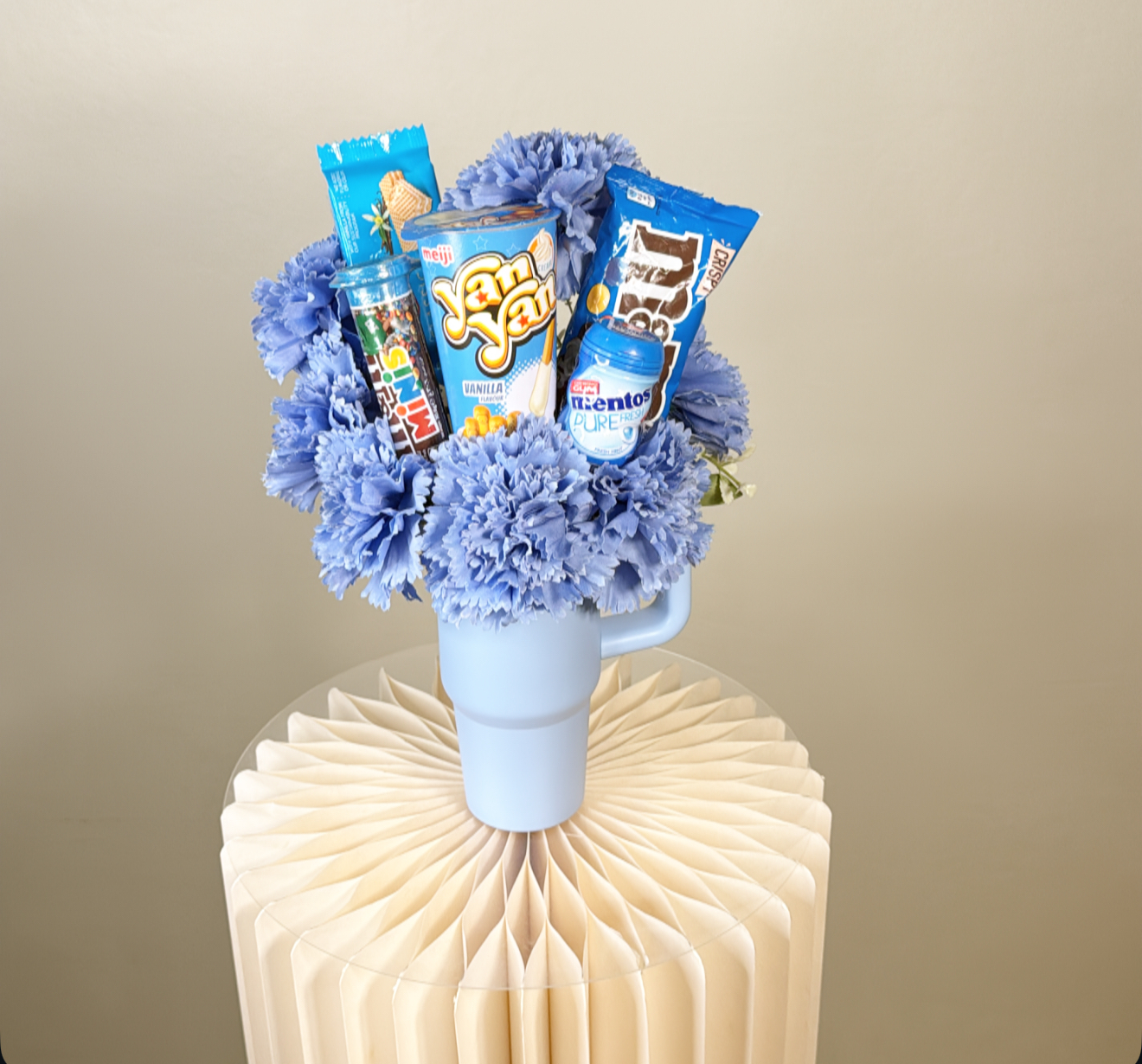 كوب حافظ للحراره بغطاء وعود حافظ للحراره مزين بالورد الصناعي .٥ قطع متنوعه من منتجات الميك اب والحلوى .شعار اكرليك حسب المناسبة .كيس وكرت اهداء خاص بالمناسبه .
