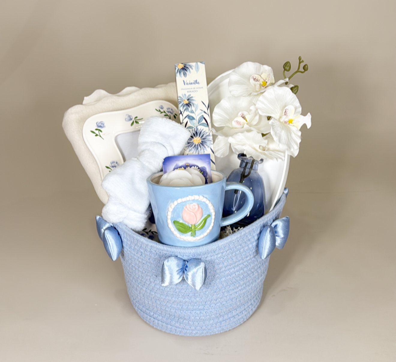 لحاف .كوب مع شاي استرخاء .برواز .شمعه معطره .دفيوزر معطر للجو .فازه اوركيد صناعي .صنيه تقديم شخصيه .باند للشعر .سله قابله لاعاده الاستخدام .شعار اكرليك حسب المناسبه .كيس وكرت اهداء خاص بالمناسبه .تصل لأحبابكم مغلفه بالتور المعطر .