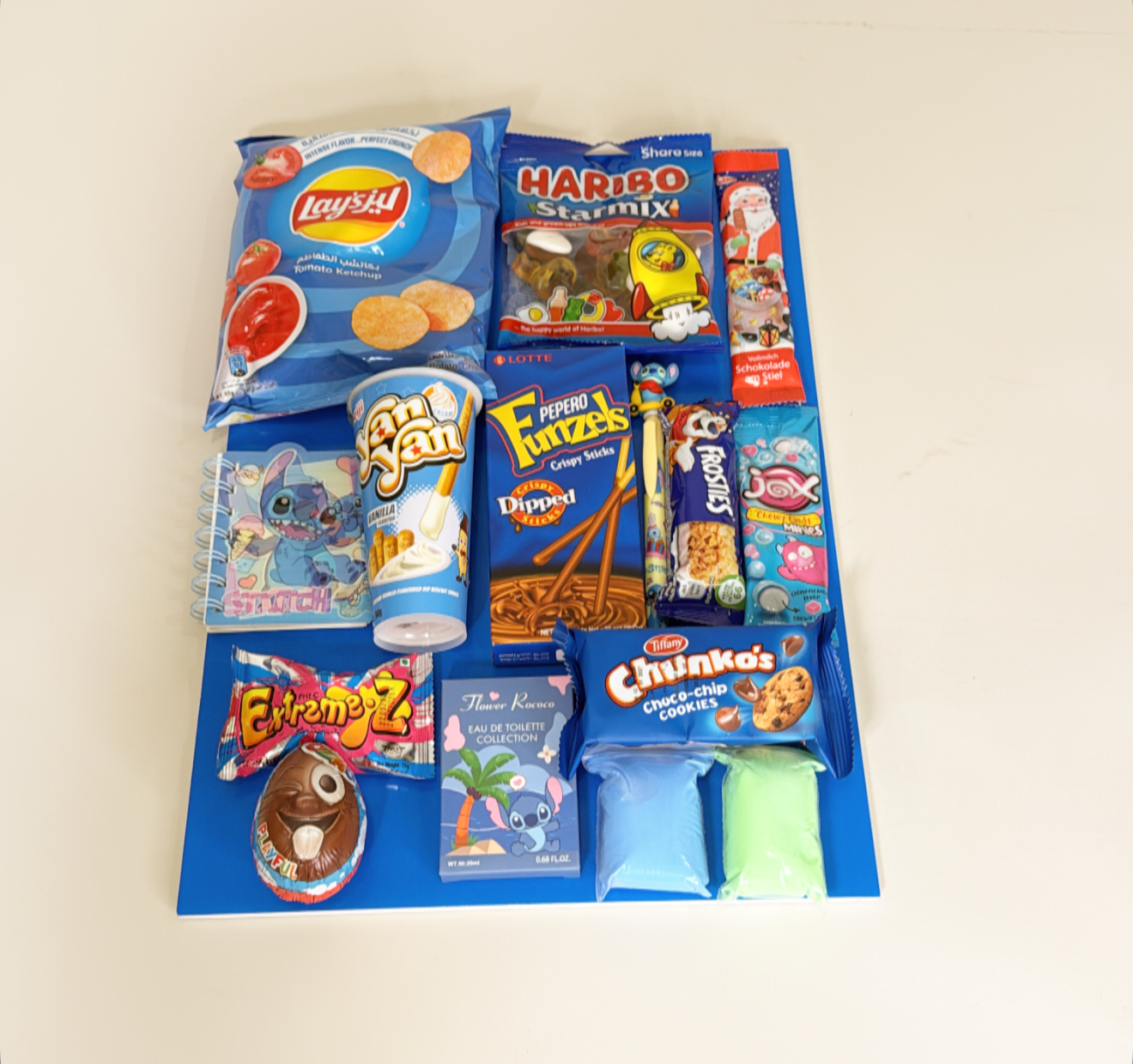 لوح على شكل حلوى يحتوي على :١٥ قطعه من منتجات الحلوى ومنتجات ستيش للأولاد .كيس وكرت اهداء خاص بالمناسبه .