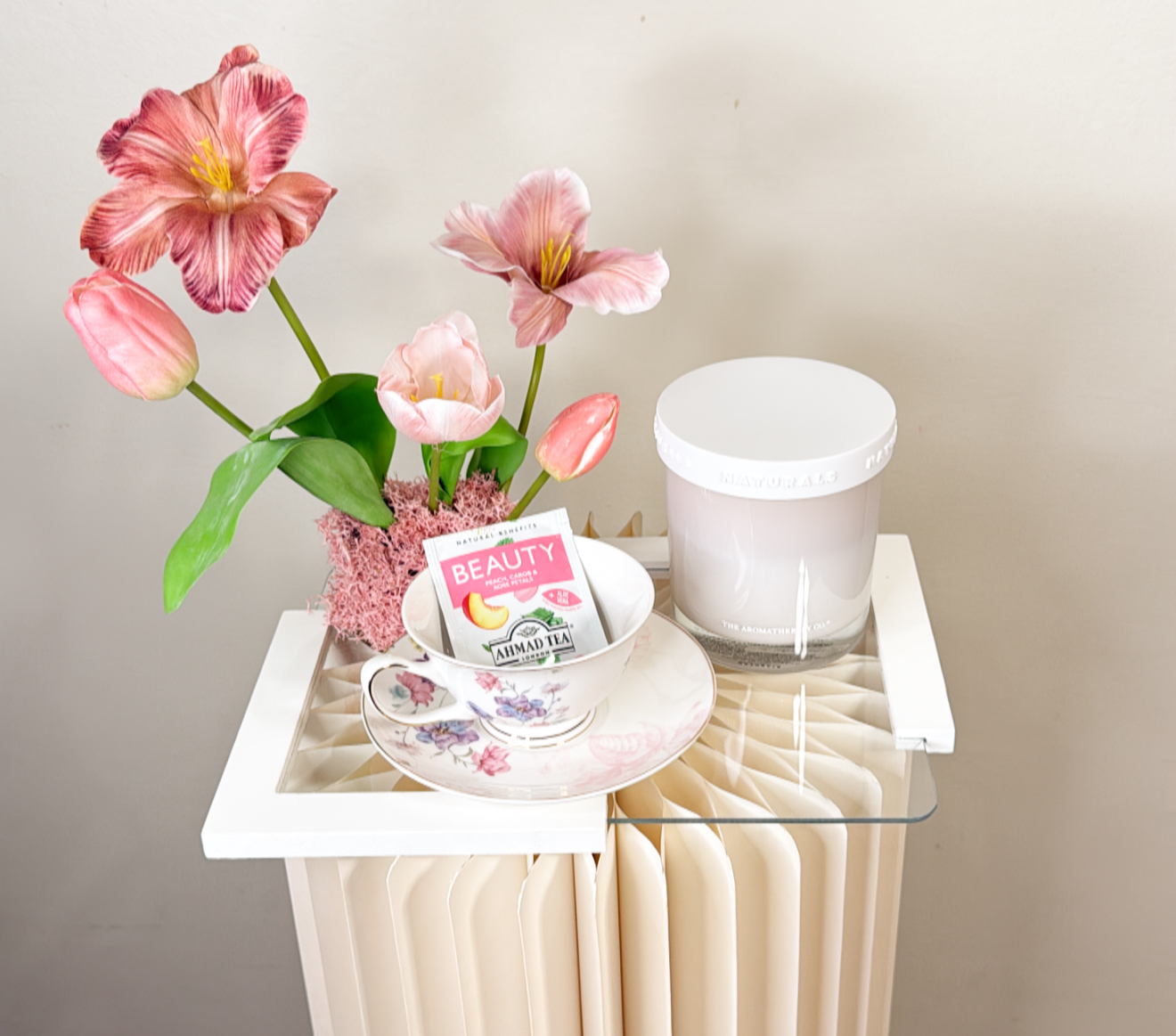 صنيه تقديم زجاجية مزينه بالتوليب الصناعي عالي الجودة مشابه للطبيعي .كوب بصحن مع شاي الجمال .شمعة معطره بعطر الزهور الهادئة .شعار اكرليك حسب المناسبة .كيس وكرت اهداء خاص بالمناسبه .تصل لاحبابكم مغلفه بالسولوفان.