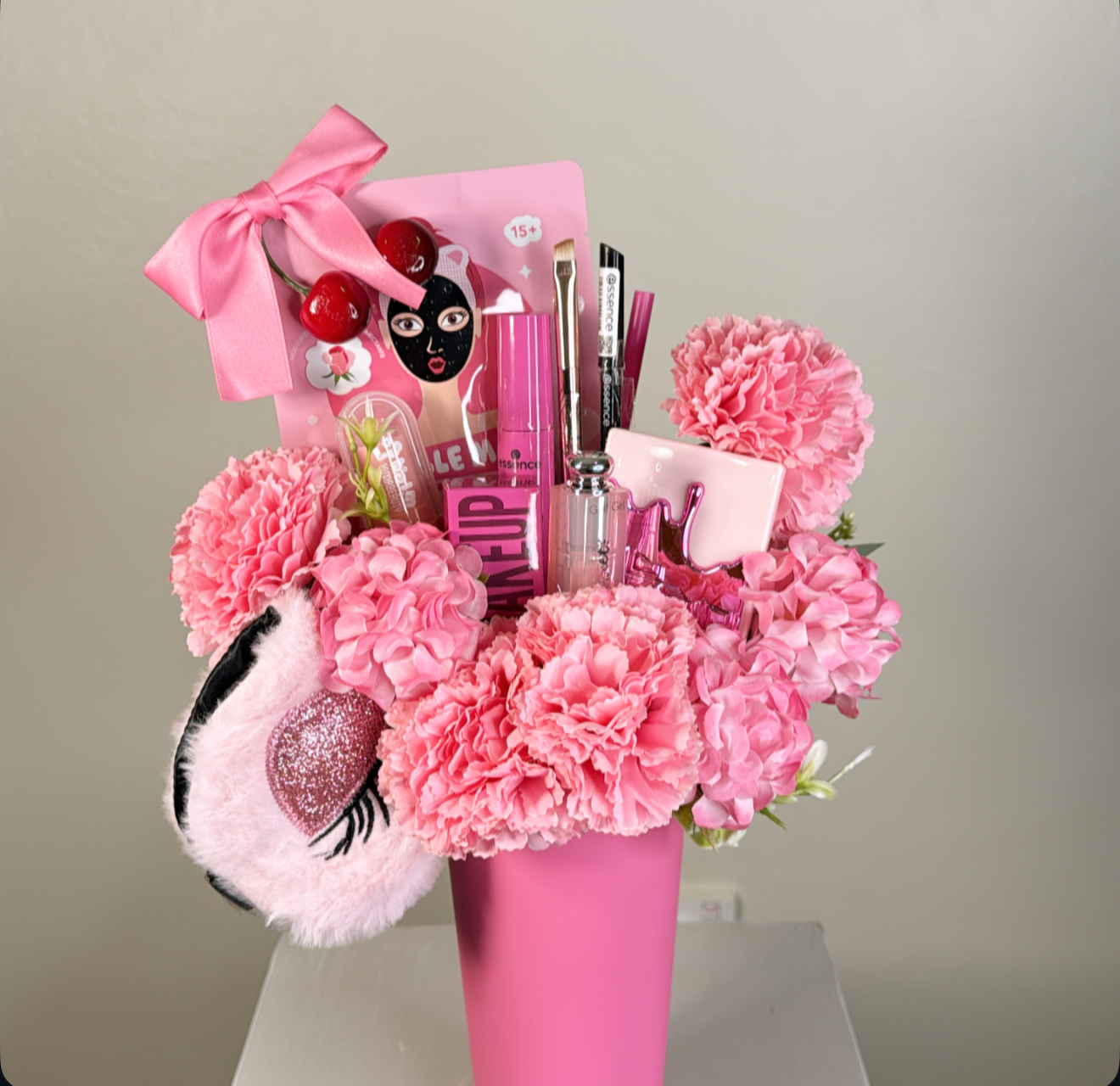 كوب بغطاء وعود ومزين بالورد الصناعي .٨ قطع متنوعه مابين منتجات الميك اب والسكن كير .غطاء للعين .شعار اكرليك حسب المناسبة .كيس وكرت اهداء خاص بالمناسبه .