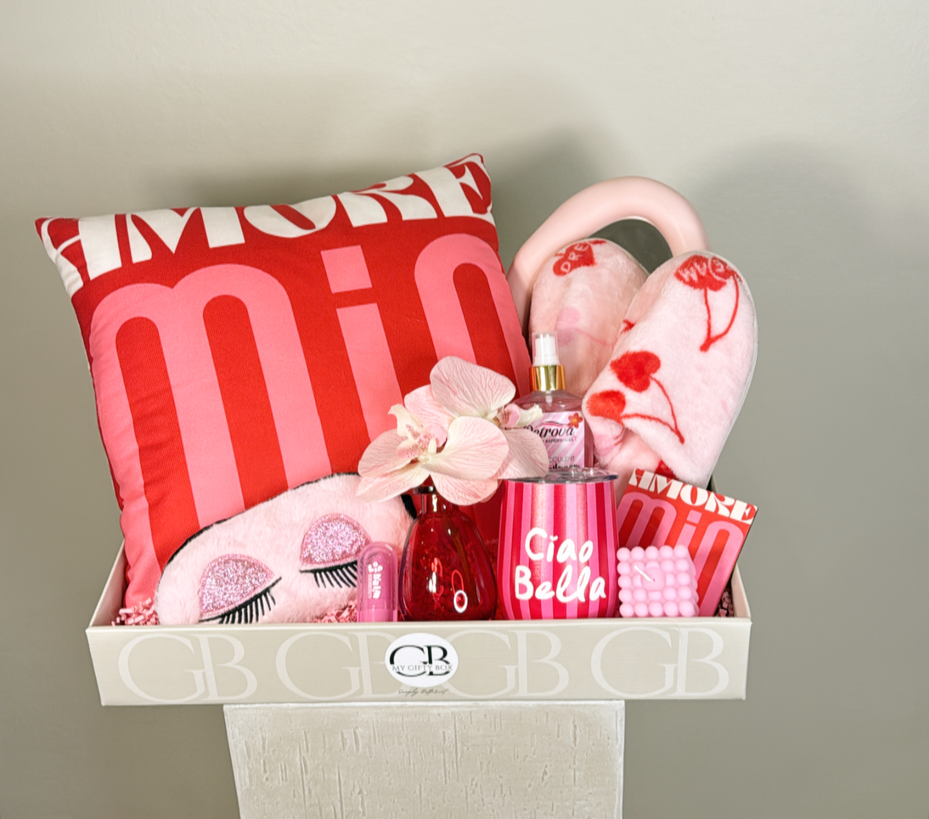 كوشيه محشوه .حذاء للمنزل .فازه اوركيد صناعي .كوب حافظ للحراره بغطاء .قاعده للكوب .شمعه مضيئه .مرايا .عطر .مرطب للشفاه .غطاء للعين .شعار اكرليك حسب المناسبة .كيس وكرت اهداء خاص بالمناسبه .تصل لاحبابكم مغلفه بالتور المعطر .