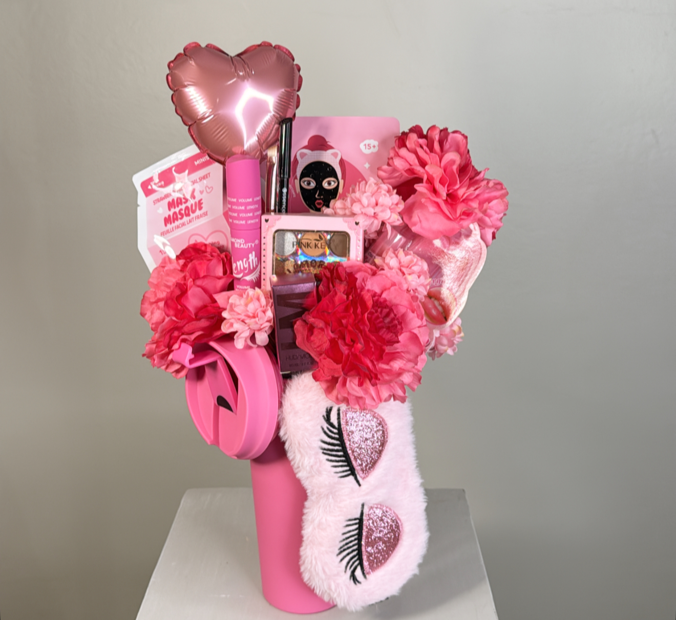 كوب بغطاء وعود ومزين بالورد الصناعي .٨ قطع متنوعه من منتجات الميك اب والسكن كير .غطاء للعين .شعار اكرليك حسب المناسبة .كيس وكرت اهداء خاص بالمناسبه .