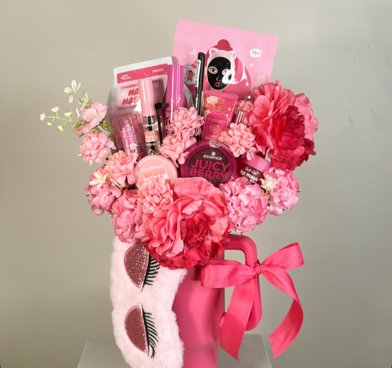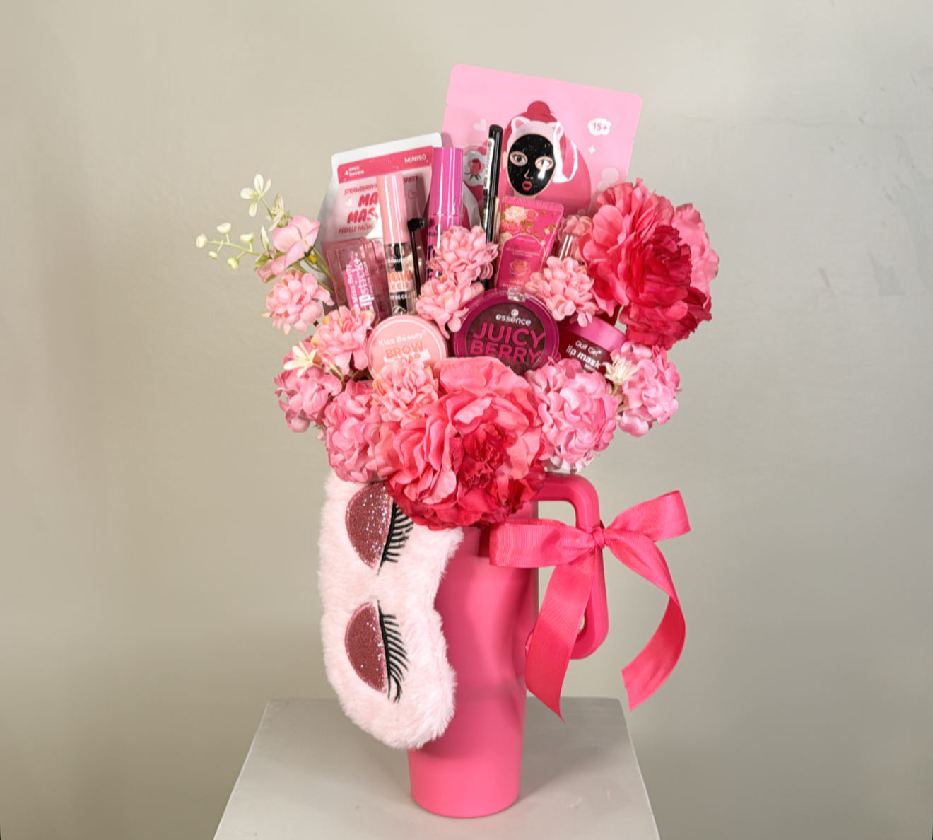 كوب حافظ للحرارة بغطاء وعود ومزين بالورد الصناعي .١٠ قطع متنوعه من منتجات الميك اب والسكن كير .غطاء للعين .شعار اكرليك حسب المناسبة .كيس وكرت اهداء خاص بالمناسبه .