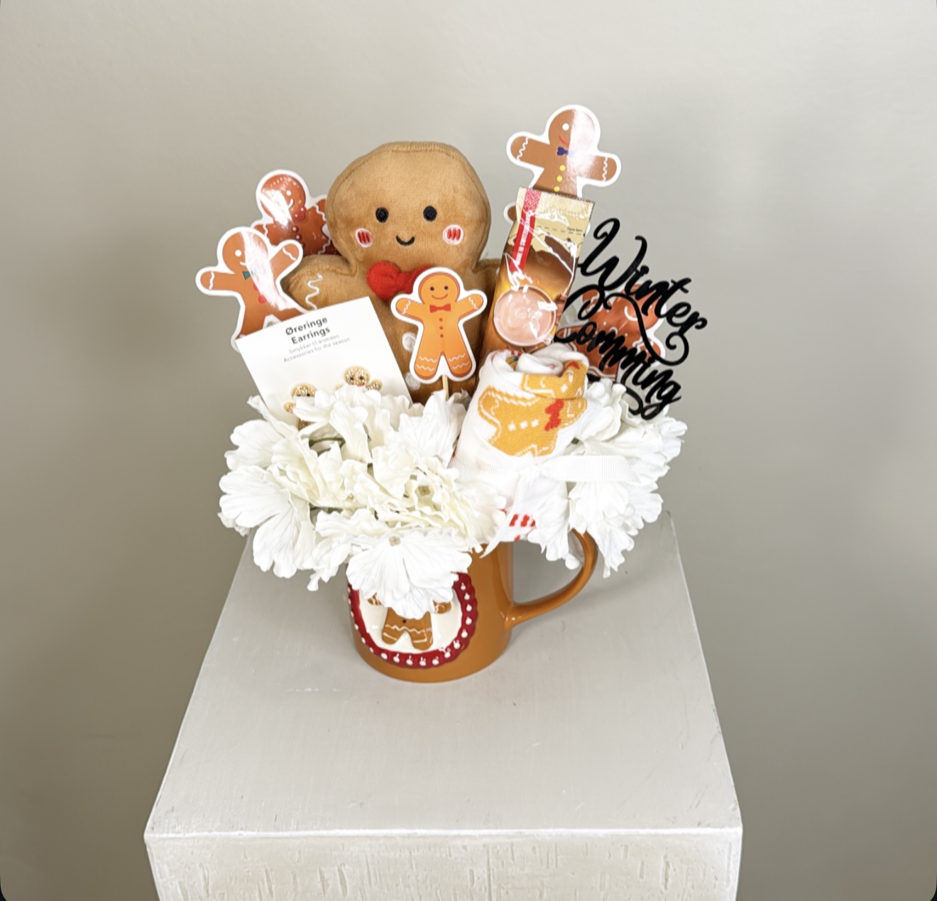 كوب جينربريد مزين بالورد الصناعي .مشروب هوت جوكلت .دميه جينجر بريد .جوارب جينجر بريد .حلق للاذن جينر بريد .شعار اكرليك للشتاء .كيس وكرت اهداء خاص بالمناسبه .