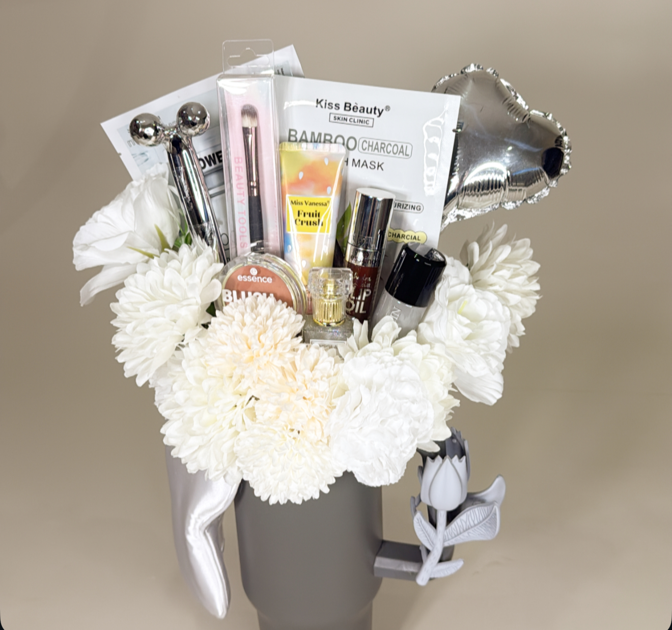 كوب حافظ للحراره بغطاء وعود ومزين بالورد الصناعي يحتوي على :١١ قطع متنوعه من منتجات الميك اب والسكن كير وكلبس للشعر وغطاء للعين .شعار اكرليك حسب المناسبه .كبس وكرت اهداء خاص بالمناسبه .