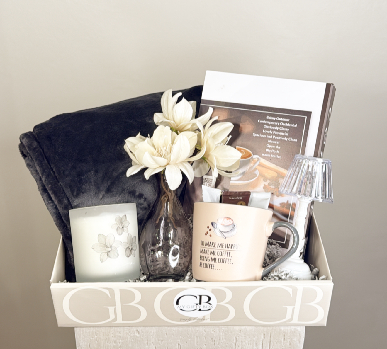 لحاف .كوب مع قهوه سريعه التحضير .ابجوره مضيئه .كتاب ديكور .كريم لليد برائحه القهوه .فازه ورد صناعي .شمعه معطره .شعار اكرليك حسب المناسبه .كيس وكرت اهداء خاص بالمناسبه .تصل لاحبابكم مغلفه بالتور المعطر .