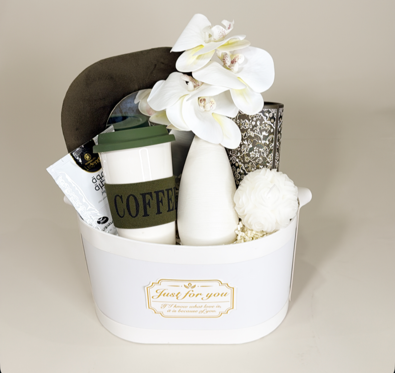 مرايا .فازه اوركيد صناعي .كوب بغطاء .ظرف قهوه مقطره سريعه التحضير .شمعه معطره .علبه كلينكس .شعار اكرليك حسب المناسبه .كيس وكرت اهداء خاص بالمناسبه .تصل لاحبابكم مغلفه بالتور المعطر .