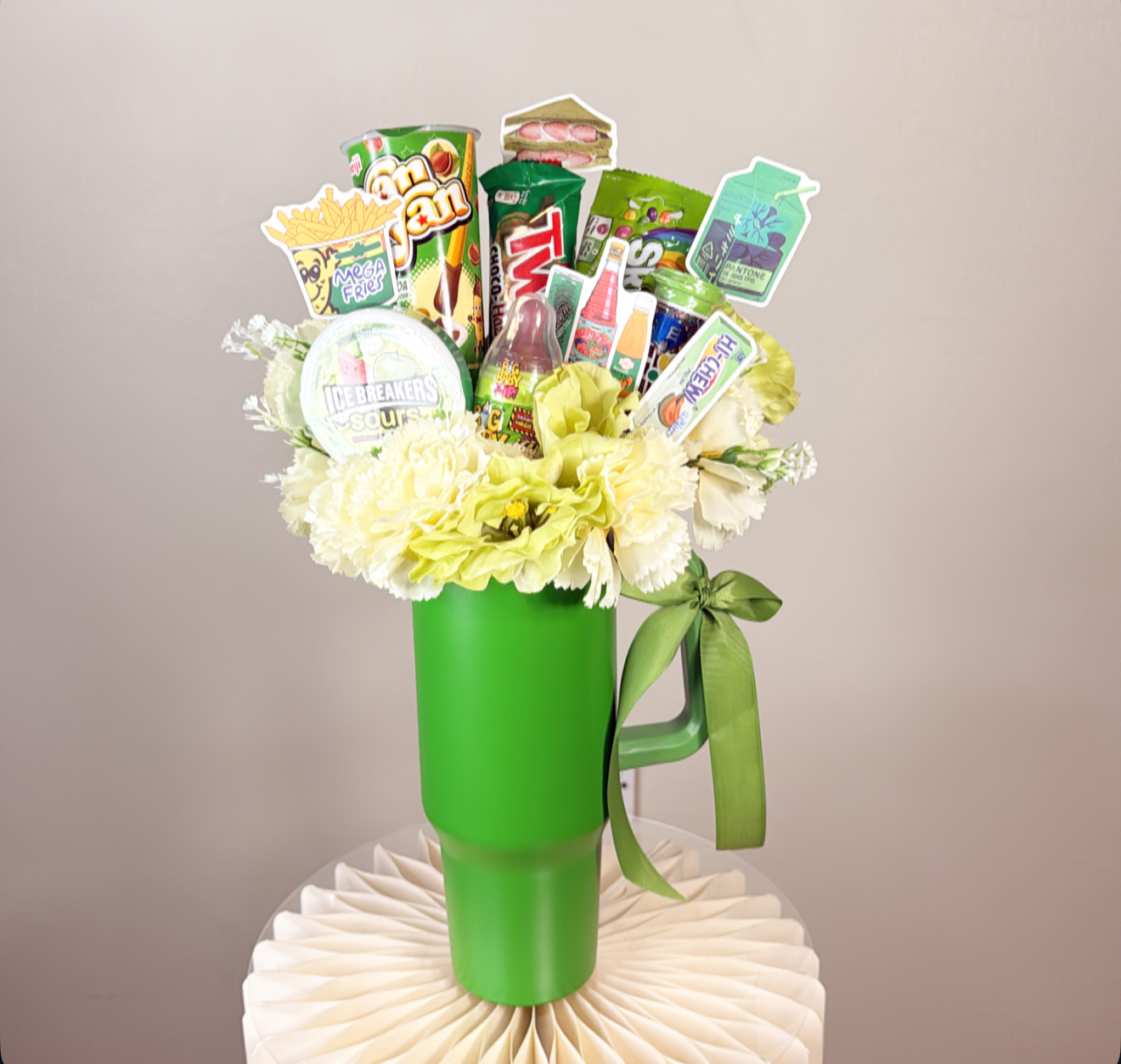 كوب حافظ للحراره بغطاء وعود حافظ للحراره مزين بالورد الصناعي .٦ قطع متنوعه من الحلوى والجوكلت .شعار اكرليك حسب المناسبة .كيس وكرت اهداء خاص بالمناسبه .