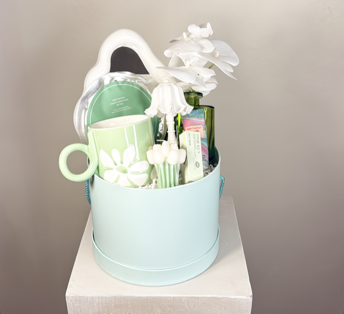 مرايا .ماسك للوجه .فازه اوركيد صناعي .كوب مع شاي استرخاء .شمعه معطره .ابجوره مضيئه تعمل بالبطارية .مرطب وملمع للشفاه .كريم لليد .شعار اكرليك حسب المناسبة .كيس وكرت اهداء خاص بالمناسبه .تصل لاحبابكم مغلفه بالنور المعطر .