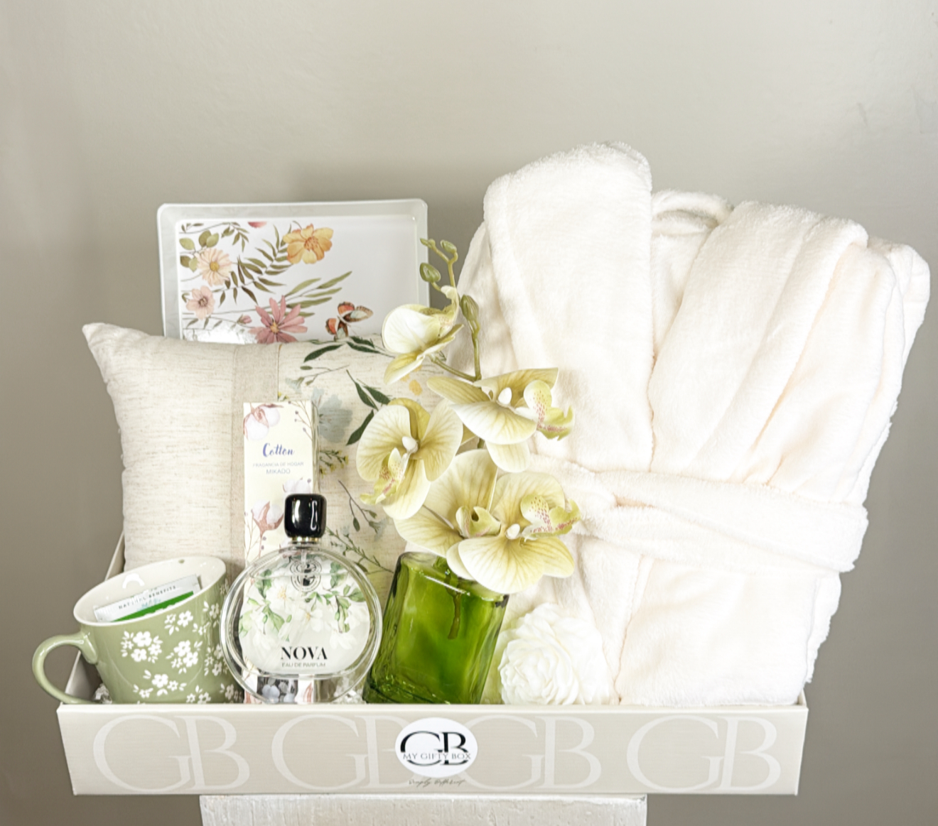 كوشيه محشوه .روب منزل قياس فري سايز .عطر .دفيوزر معطر للجو .شمعه معطره .صنيه تقديم .فازه اوركيد صناعي .كوب مع شاي استرخاء .شعار اكرليك حسب المناسبه .كيس وكرت اهداء خاص بالمناسبه .تصل لاحبابكم مغلفه بالتور المعطر .