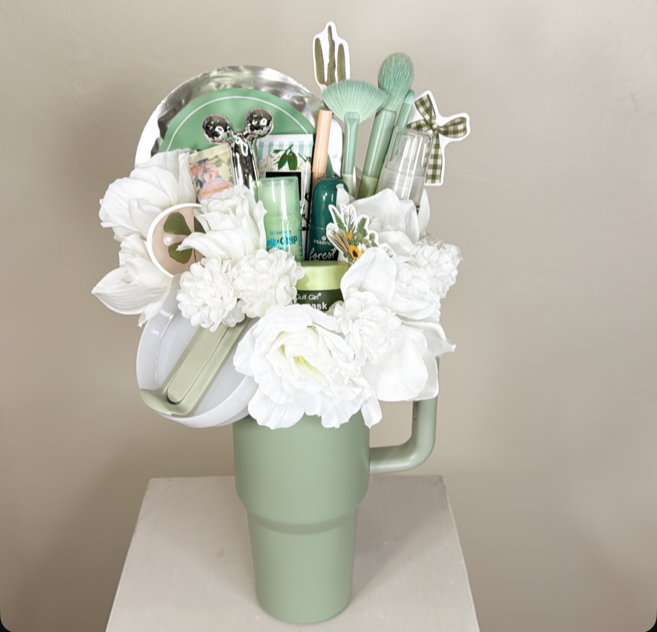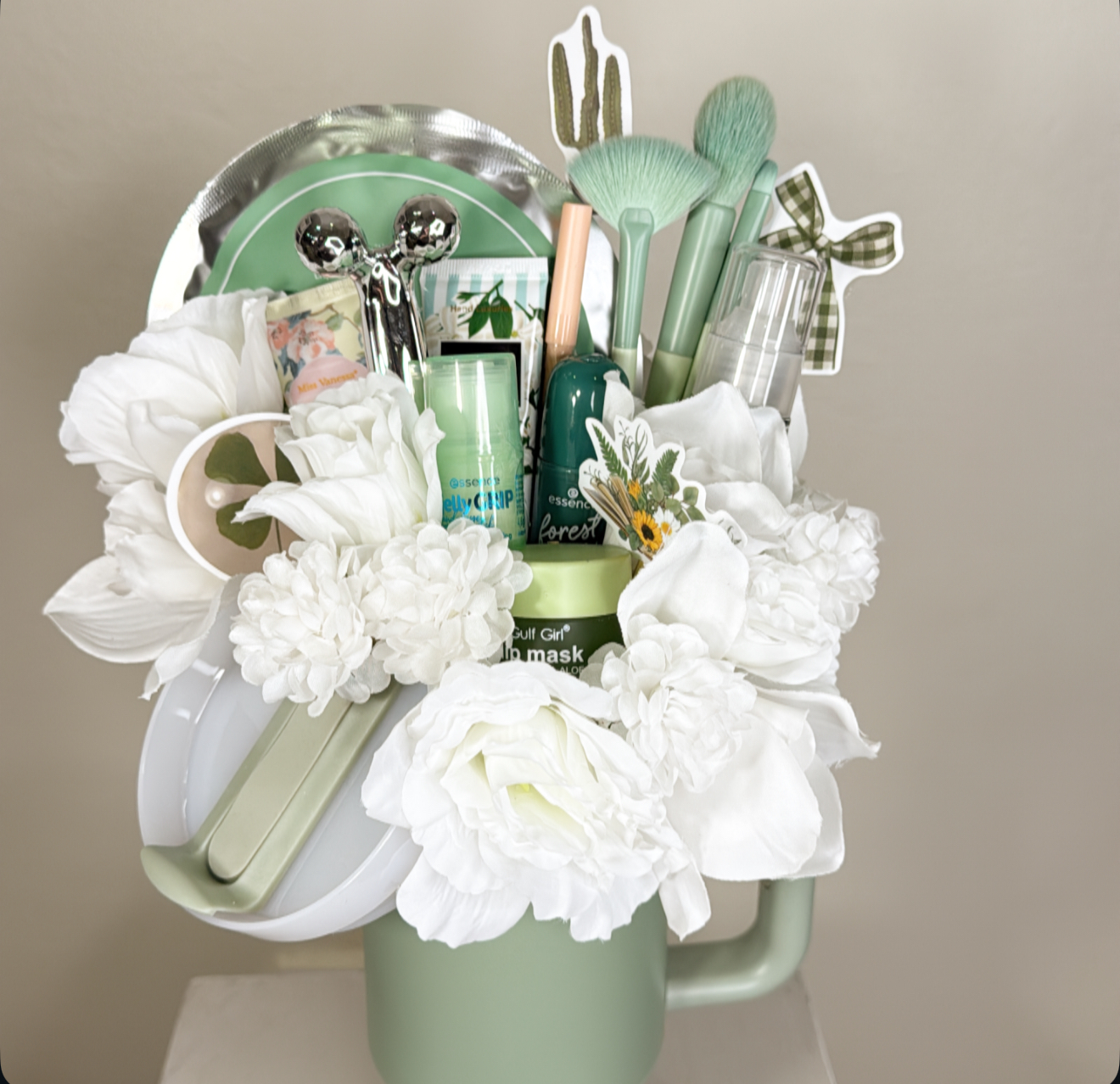 كوب حافظ للحراره بغطاء وعود ومزين بالورد الصناعي .١٢ قطعه متنوعه من منتجات العنايه بالبشره والعنايه الشخصيه وأدوات الميك اب .شعار اكرليك حسب المناسبه .كيس وكرت اهداء خاص بالمناسبه .