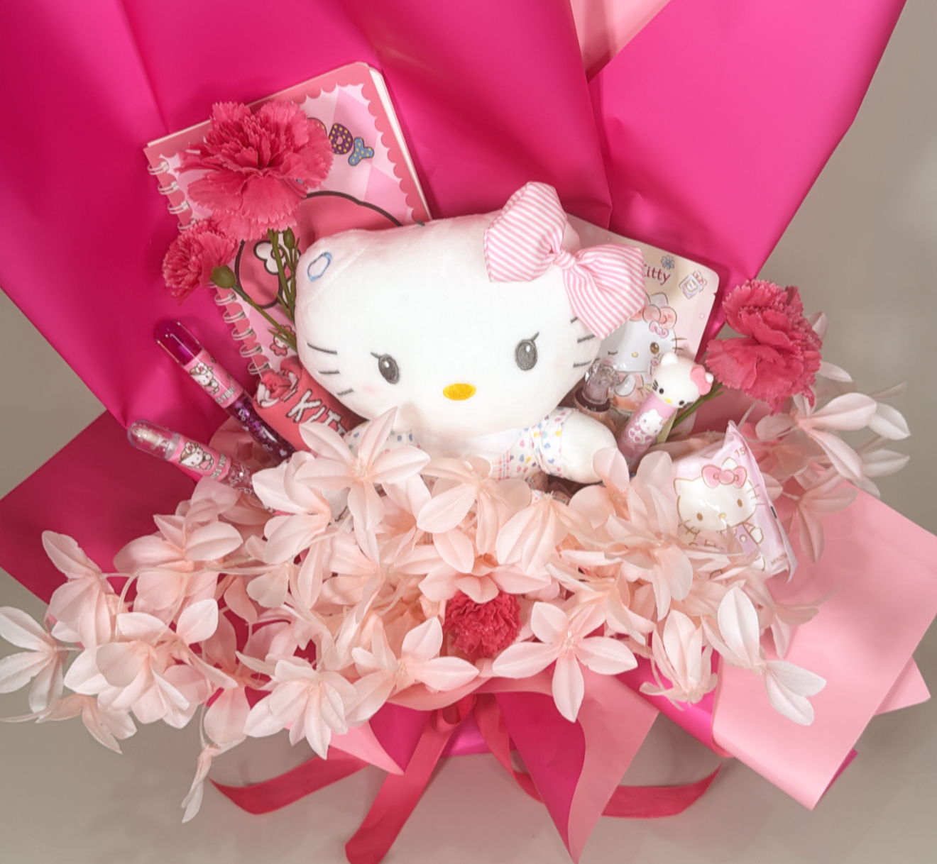 باقة هاند بوكيه مزينه بالورد الصناعي .دميه هيلوكيتي القطنيه .٣ مرطب ومورد للشفاه .مفكره تدوين - صمغ هيلوكيتي .مناديل مبلله هيلوكيتي .٢ جوارب هيلوكيتي .ماسك للوجه هيلوكيتي .شعار اكرليك حسب المناسبه .كيس وكرت اهداء خاص بالمناسبه .