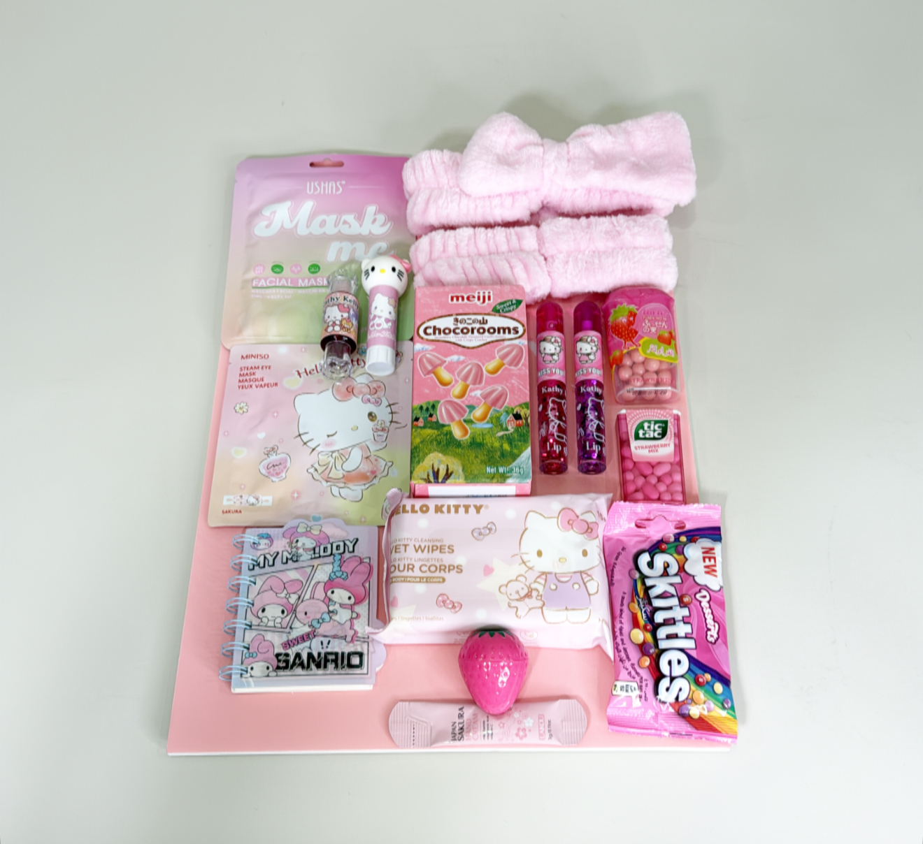 لوح على شكل حلوى يحتوي على :١٦ قطعه من منتجات الحلوى ومنتجات هيلوكيتي للميك اب والسكن كير والأدوات المكتبيه .كيس وكرت اهداء خاص بالمناسبه .