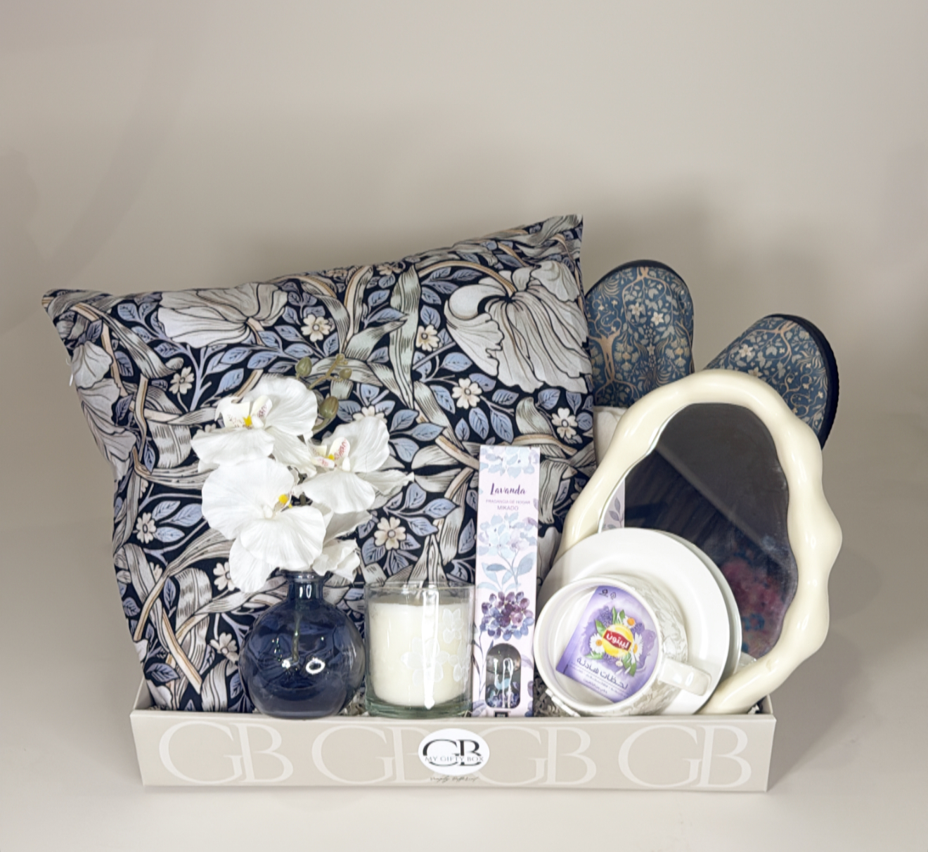 لحاف .كوشيه محشوه .حذاء للمنزل .مرايا .كوب بصحن مع شاي استرخاء .شمعه معطره .فازه اوركيد صناعي .دفيوزر معطر للجو .شعار اكرليك حسب المناسبه .كيس وكرت اهداء خاص بالمناسبه .تصل لاحبابكم مغلفه بالتور المعطر .