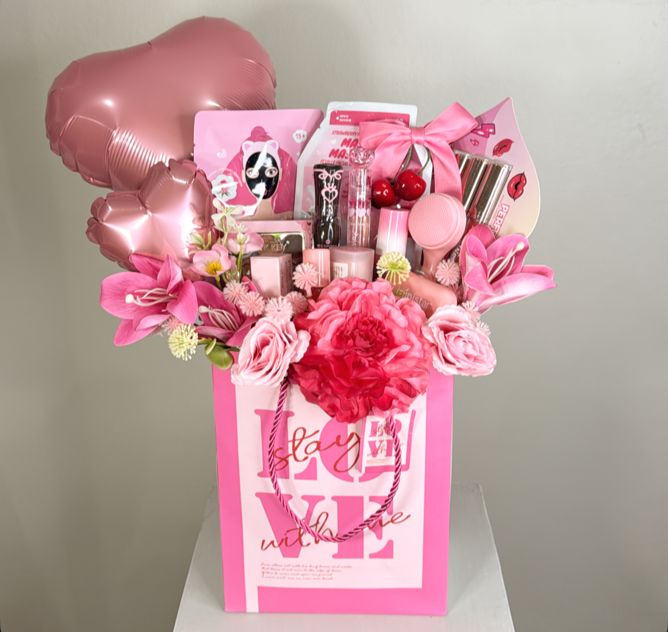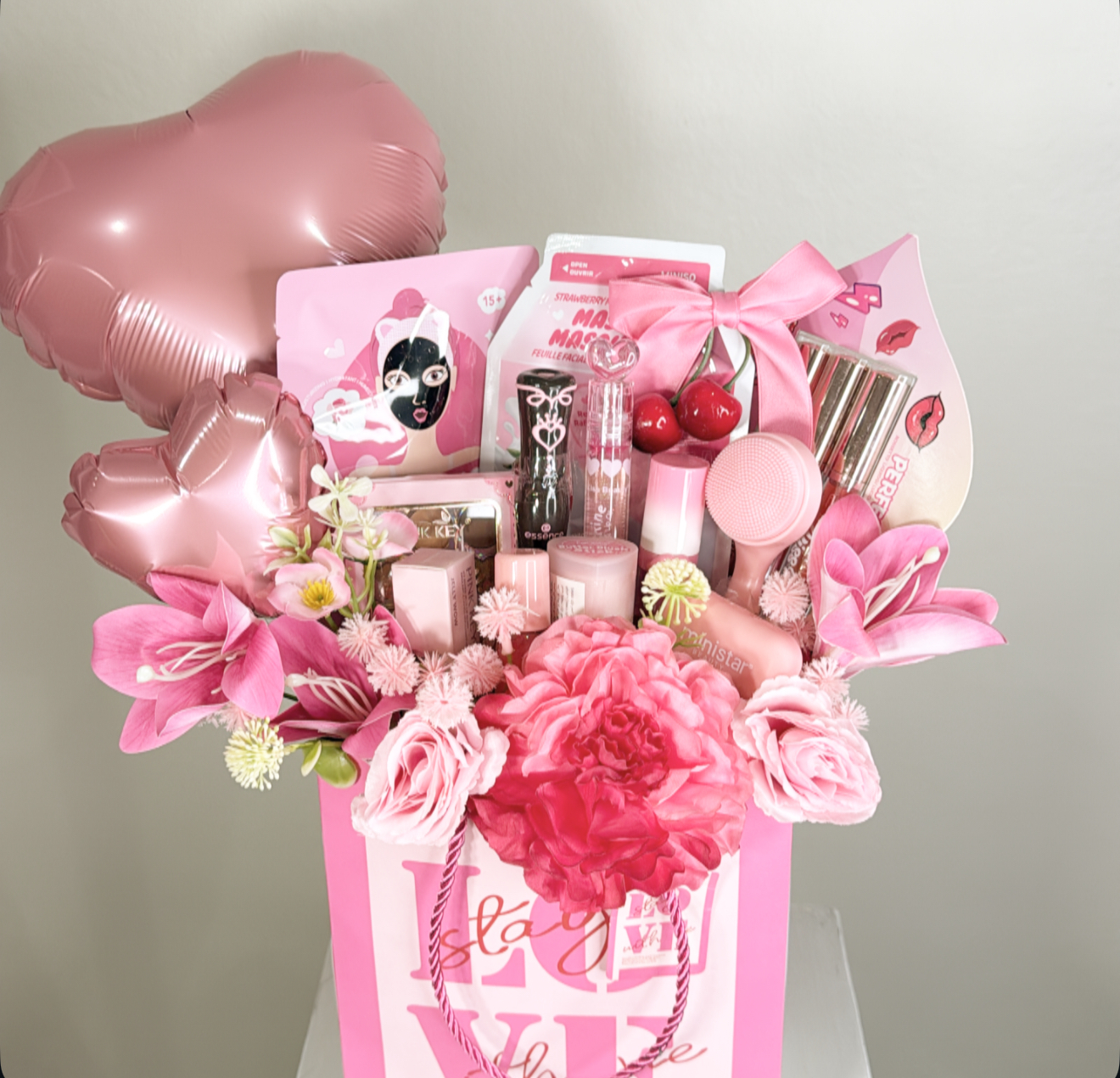 كيس مزين بالورد الصناعي و يحتوي على :١٣ قطعه متنوعه من منتجات العنايه بالبشره والميك اب .بالونات على شكل قلب .شعار اكرليك حسب المناسبه .كيس وكرت اهداء خاص بالمناسبه .
