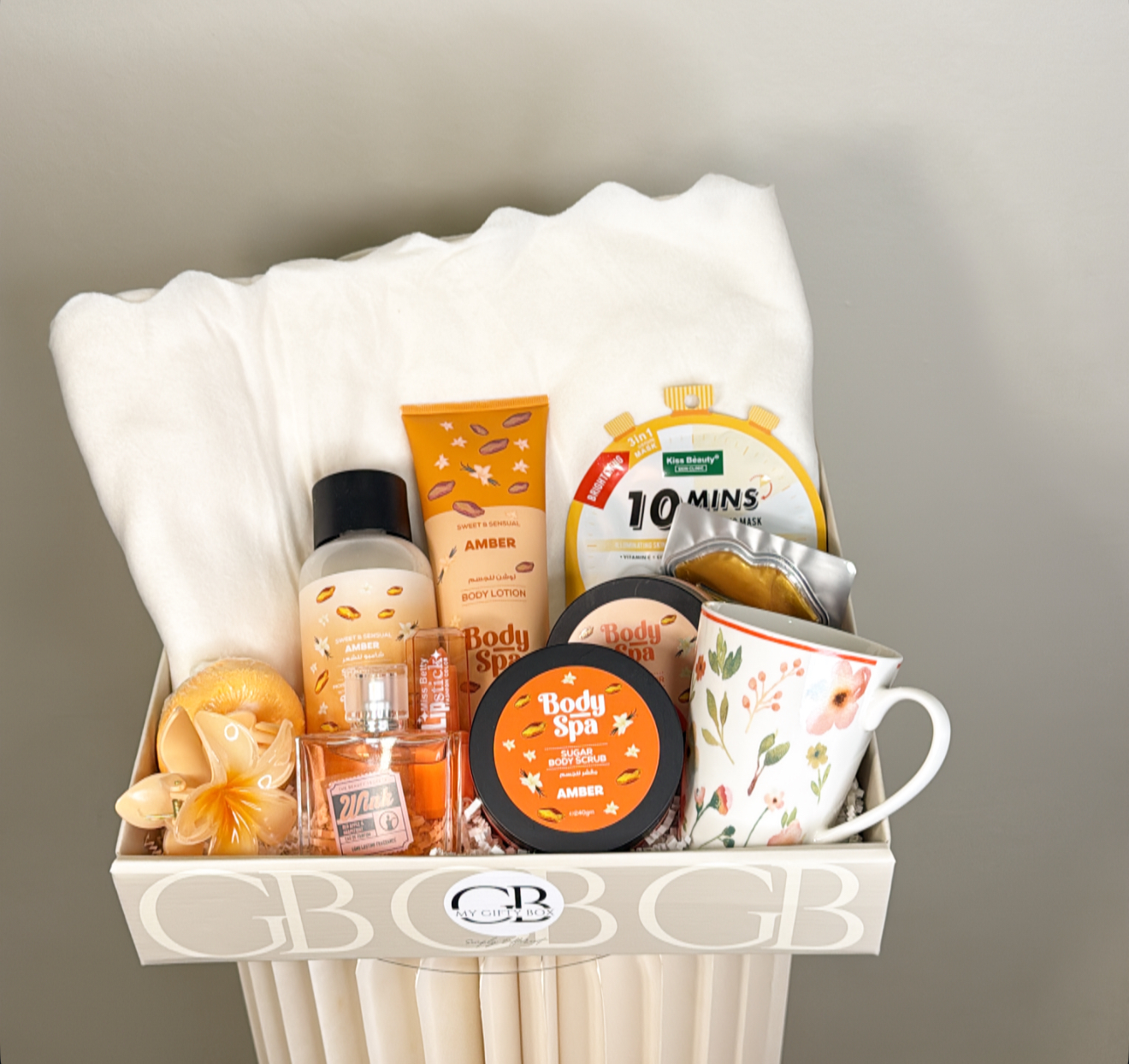 لحاف .مقشر للجسم .زبده للجسم .لوشن للجسم .شامبو شعر .باث بمب .ماسك للوجه .ماسك للشفاه .مرطب للشفاه .كوب مع شاي المساء .عطر .كلبس للشعر .شعار اكرليك حسب المناسبة .كيس وكرت اهداء خاص بالمناسبه .تصل لاحبابكم مغلفه بالتور المعطر .