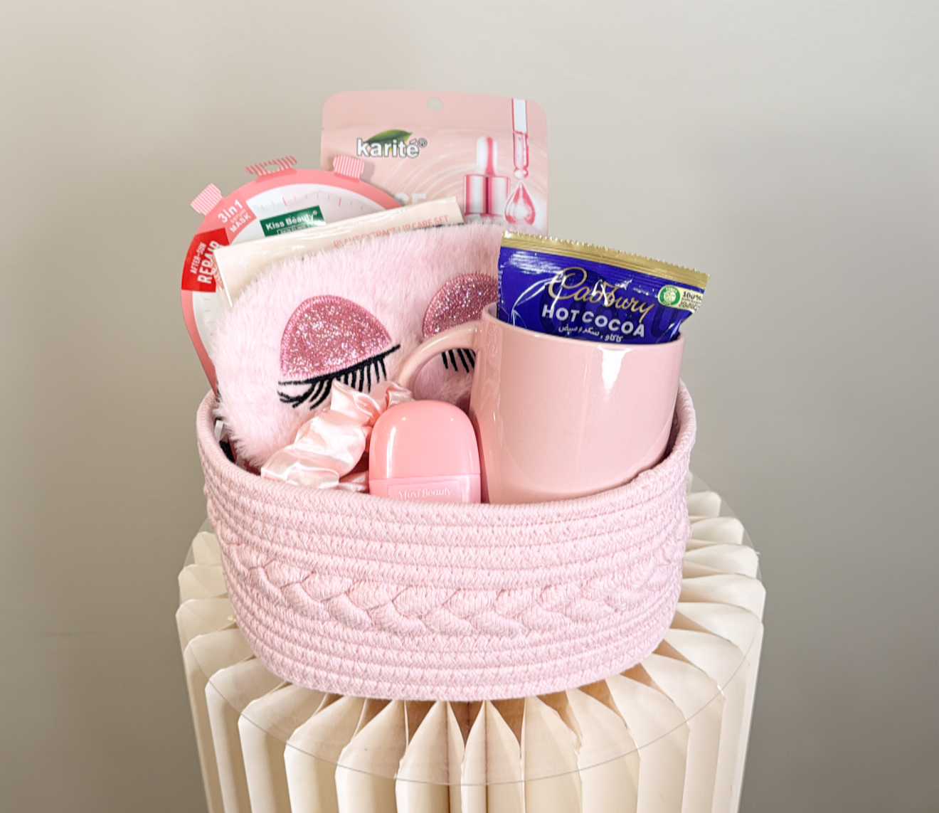 ٢ ماسك للوجه .كوب مع مشروب هوت جوكلت .مرطب ومورد للشفاه .غطاء للعين .كريم لليد .ربطه شعر .سله قابله لاعاده الاستخدام .شعار اكرليك حسب المناسبة .كيس وكرت اهداء خاص بالمناسبه .تصل لاحبابكم مغلفه بالتور المعطر .