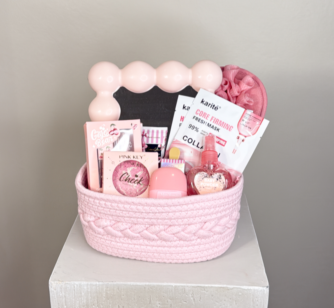 مرايا .مرطب وملمع للشفاه .٢ ماسك للوجه .عطر .إسفنجة تنظيف الجسم .٢ كريم لليد .بلاشر للخد .مرطب وملمع للشفاه .سلة قابله لاعاده الاستخدام .شعار اكرليك حسب المناسبة .كيس وكرت اهداء خاص بالمناسبه .تصل لأحبابكم مغلفه بالتور المعطر .