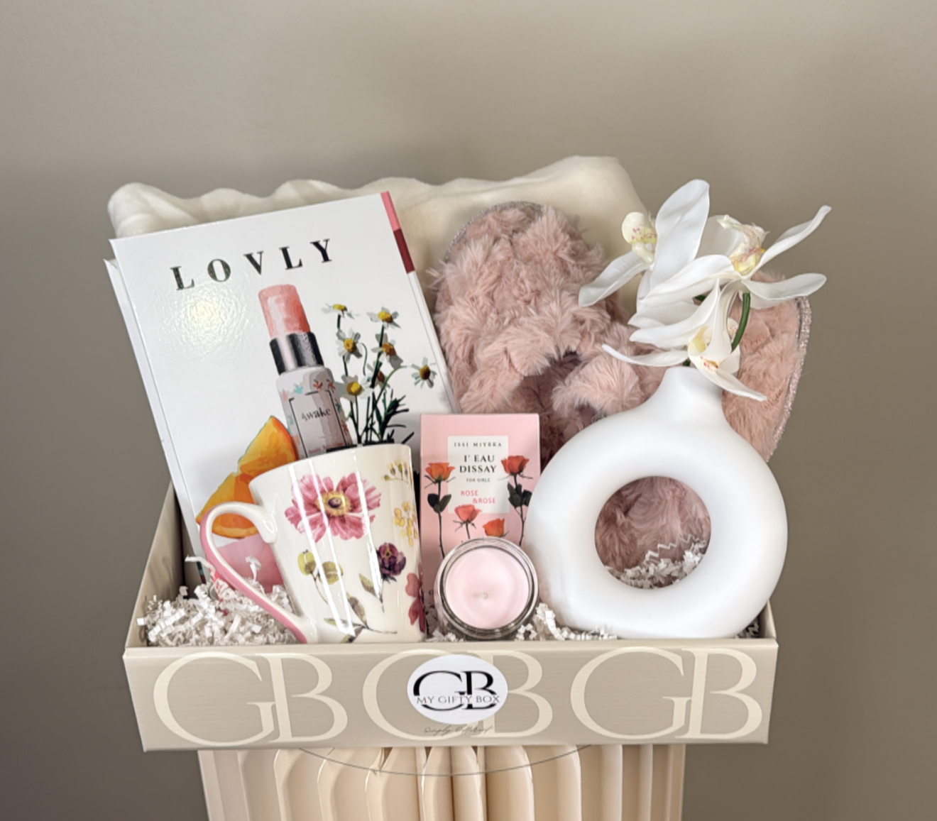 لحاف .حذاء للمنزل .كتاب ديكور .فازه أوركيد صناعي .كوب بصحن مع شاي استرخاء .شمعه معطره .عطر .شعار اكرليك حسب المناسبه .كيس وكرت اهداء خاص بالمناسبه .تصل لاحبابكم مغلفه بالتور المعطر .