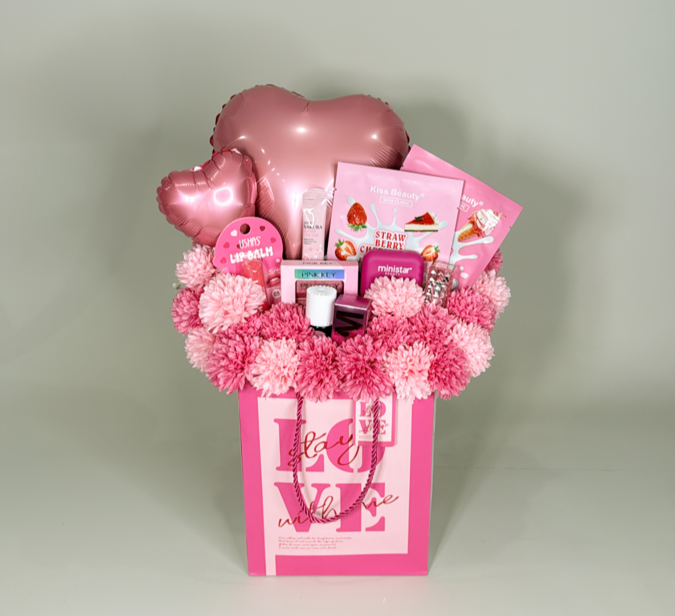 كيس مزين بالورد الصناعي .يحتوي على ٩ قطعه متنوعه من منتجات الميك اب والسكن كير .شعار اكرليك حسب المناسبه .كيس وكرت اهداء خاص بالمناسبه .