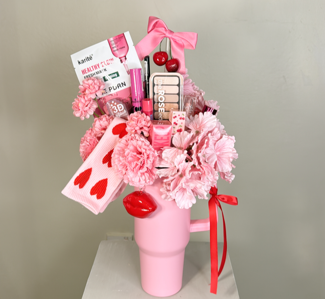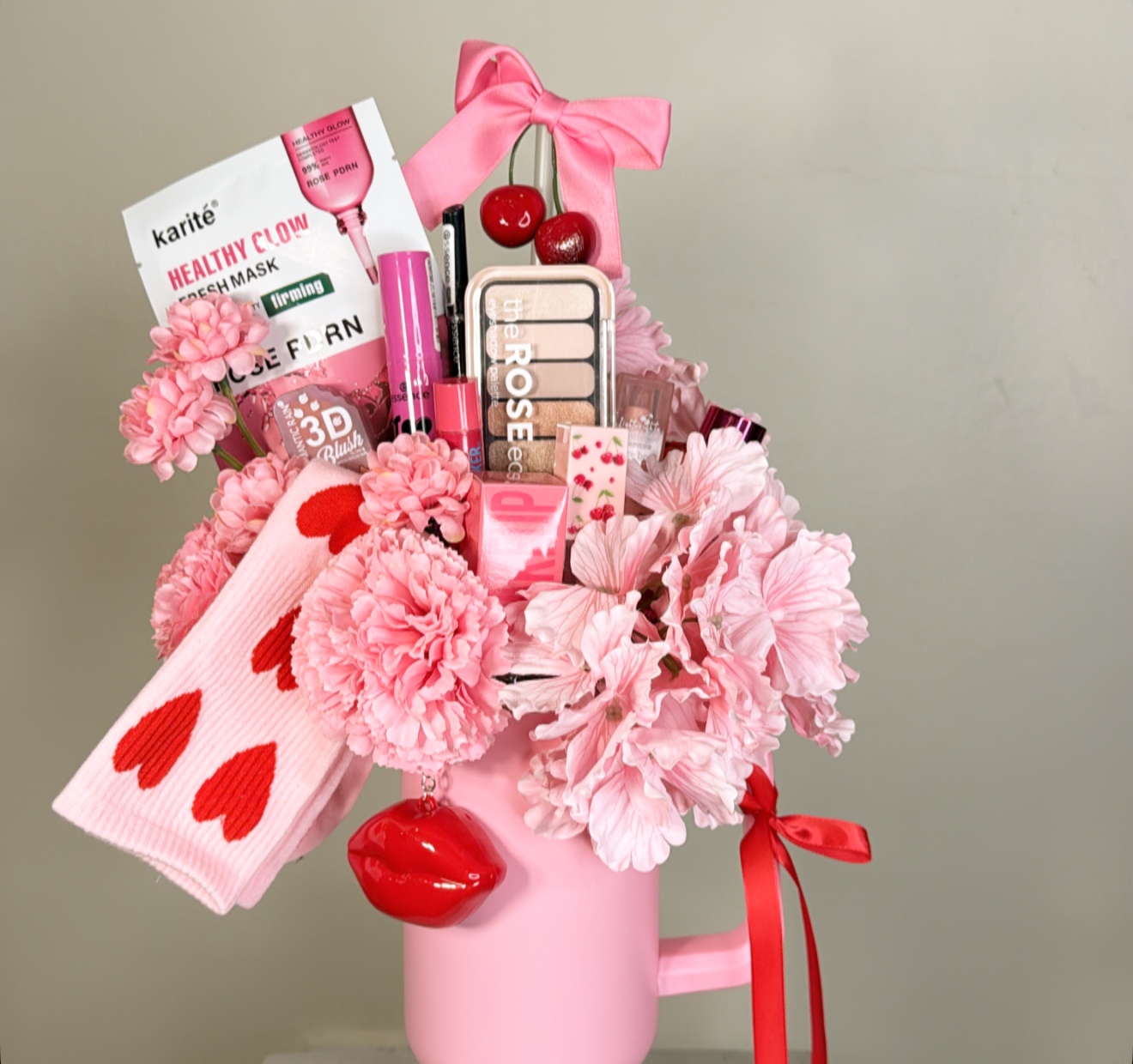 كوب حافظ للحراره بغطاء وعود ومزين بالورد الصناعي .١٢ قطعة متنوعه من منتجات الميك اب والسكن كير .جوارب .كلبس للشعر .شعار اكرليك حسب المناسبة .كيس وكرت اهداء خاص بالمناسبه .