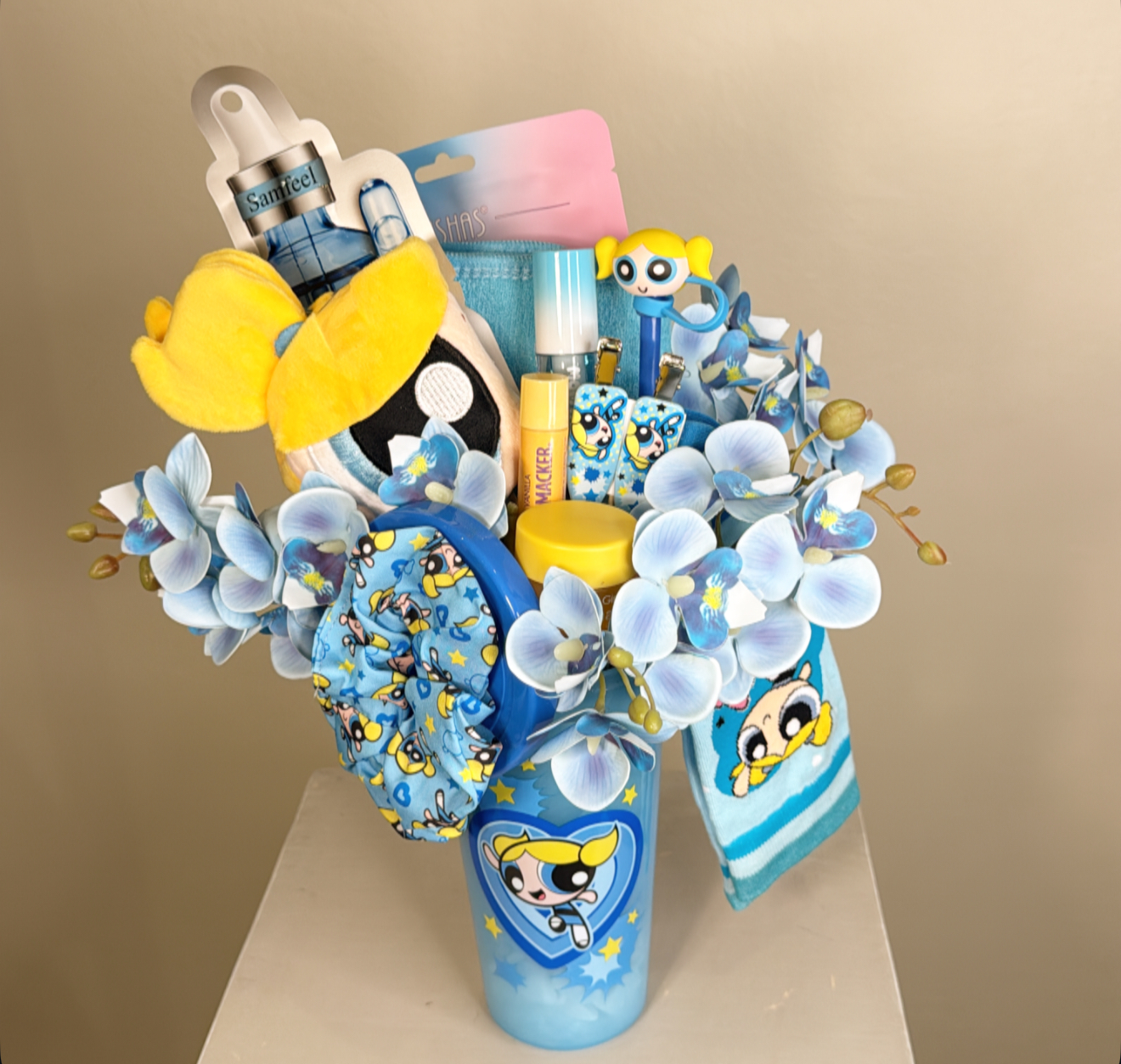 كوب فتيات القوه بغطاء وعود وغطاء للعود ومزين بالورد الطبيعي .غطاء للعين .٢ ماسك للوجه .باند للشعر .٢ مرطب وملمع للشفاه .ماسك للشفاه .٢ كلبس للشعر .ربطه للشعر .جوارب .شعار اكرليك حسب المناسبة .كيس وكرت اهداء خاص بالمناسبه .