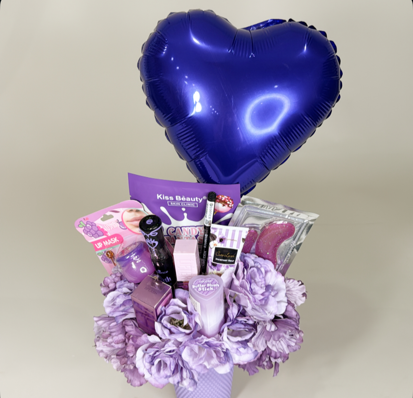 كوب بغطاء وعود مزين بالورد الصناعي يحتوي على :١٠ قطع من منتجات الميك اب والسكن كير .شعار اكرليك حسب المناسبه .كيس وكرت اهداء خاص بالمناسبه .