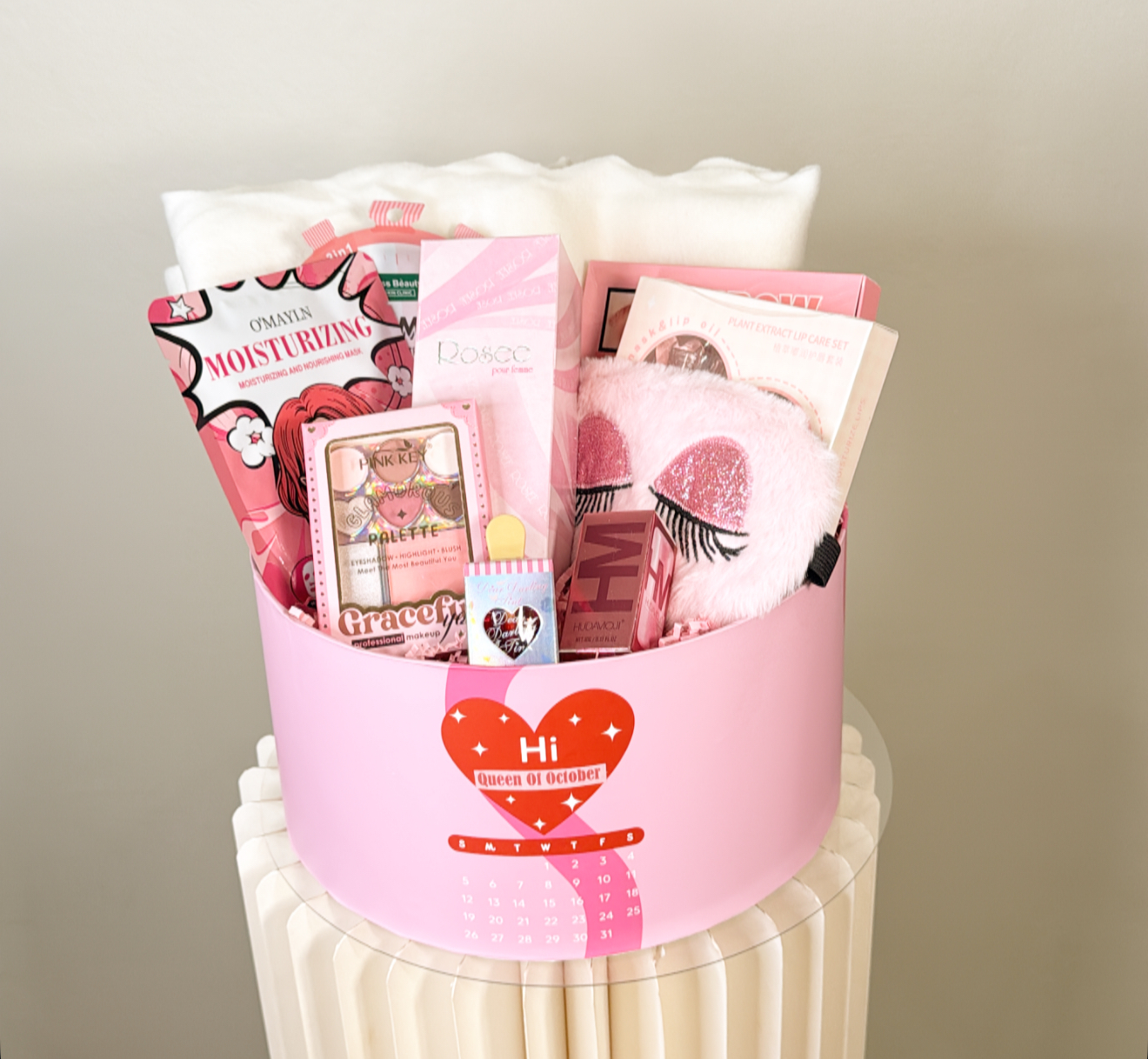 لحاف .٢ ماسك للوجه .مرطب وملمع للشفاه .غطاء للعين .باليت ميك اب متنوع .طقم ترتيب الحواجب .مورد شفاه .مورد للخد .عطر .شعار اكرليك حسب المناسبة .كيس وكرت اهداء خاص بالمناسبه .تصل لاحبابكم مغلفه بالتور المعطر .