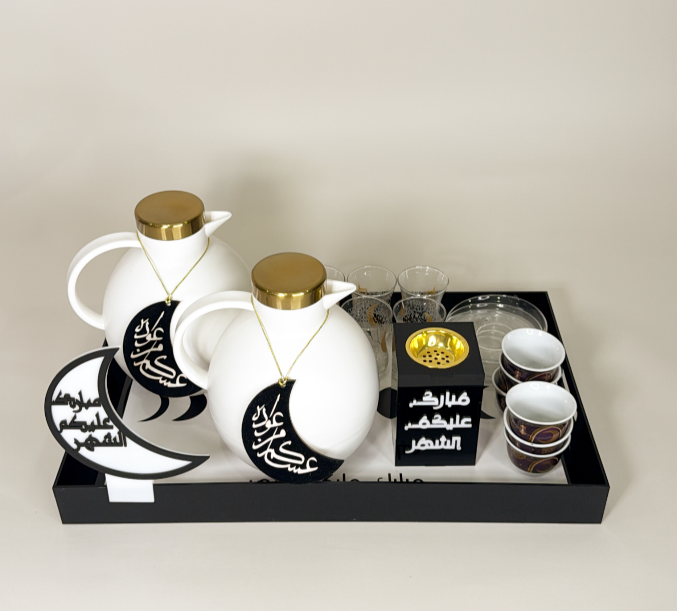 صنيه تقديم بهلال قابل للازاله .٢ مطاره حافظه للحراره بتعليقه رمضانيه .٦ استكانات رمضانيه و ٦ صحون .٦ فناجيل قهوه .مبخر بعباره مبارك عليكم الشهر .شعار اكرليك حسب المناسبه .كيس وكرت اهداء خاص بالمناسبه .تصل لاحبابكم مغلفه بالسولوفان .