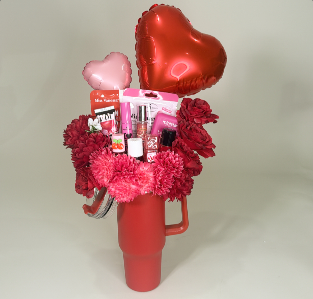 كوب حافظ للحراره بغطاء وعود ومزين بالورد الصناعي .١٠ قطع متنوعه من منتجات الميك اب والسكن كير .شعار اكرليك حسب المناسبه .كيس وكرت اهداء حسب المناسبه .