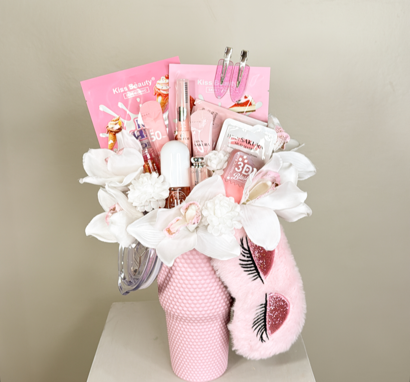 كوب حافظ للحراره بغطاء ومزين بالورد الصناعي .١١ قطعه متنوعه من منتجات العنايه بالبشره والعنايه الشخصيه .٢ كلبس للشعر .غطاء للعين .شعار اكرليك حسب المناسبه .كيس وكرت اهداء خاص بالمناسبه .