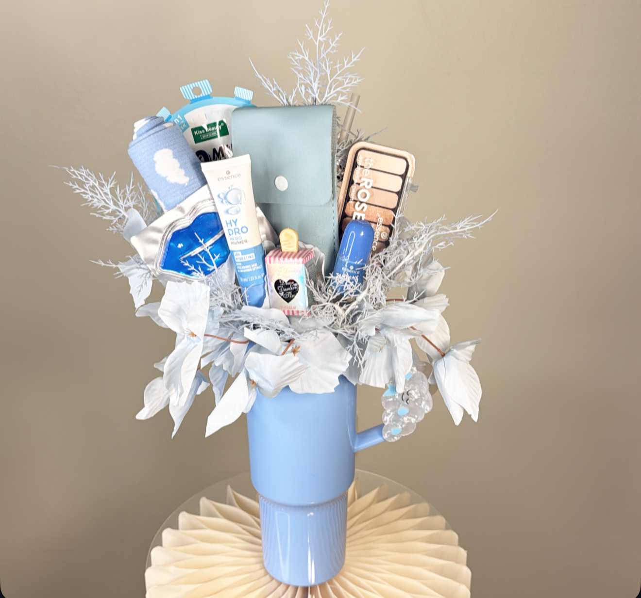 كوب حافظ للحراره بغطاء وعود حافظ للحراره مزين بالورد الصناعي .٧ منتجات متنوعه من السكن كير والميك اب .كلبس للشعر .جوارب .شعار اكرليك حسب المناسبة .كيس وكرت اهداء خاص بالمناسبه .