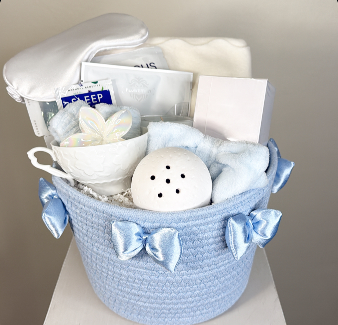 لحاف .غطاء للعين .مبخر .عطر .٢ ماسك للوجه .باند لليد - باند للشعر .كوب مع شاي استرخاء .كلبس للشعر .شمعه معطره .سلة قابله لاعاده الاستخدام .شعار اكرليك حسب المناسبة .كيس وكرت اهداء خاص بالمناسبه .