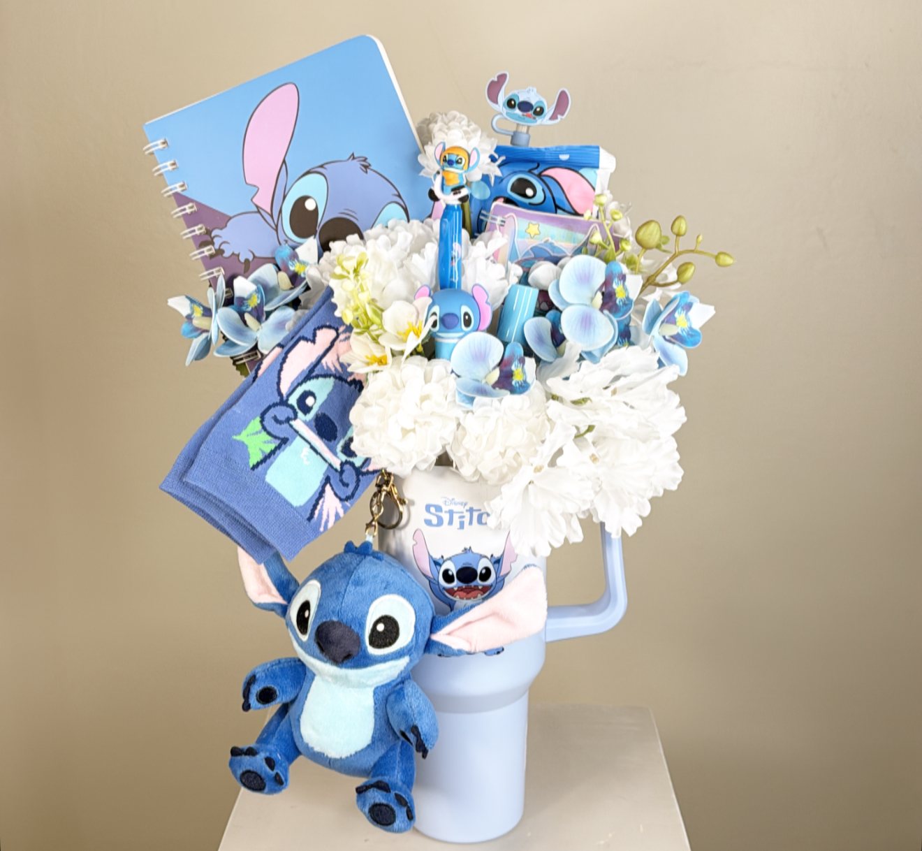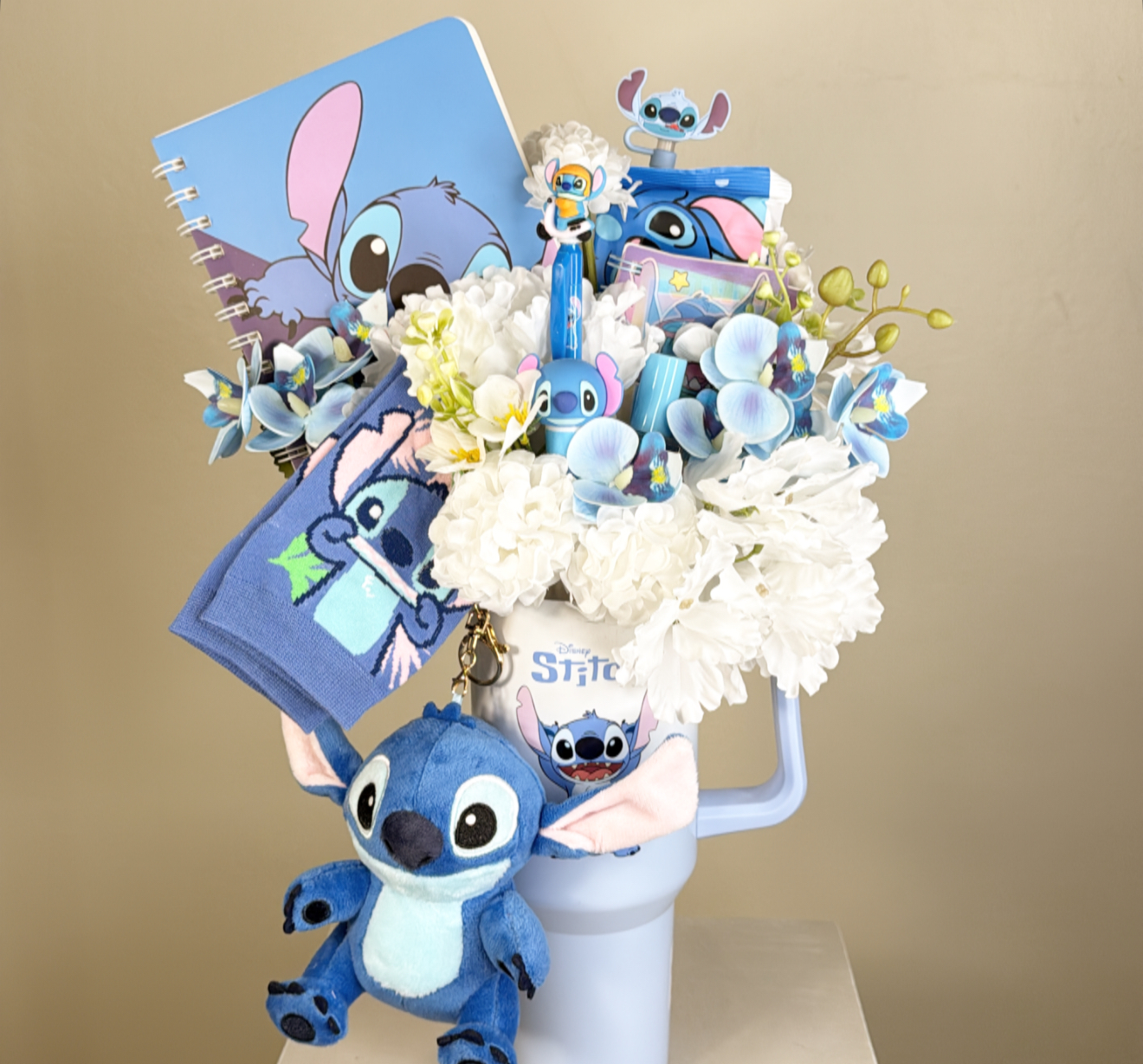 كوب ستيش حافظ للحراره بغطاء وعود ومزين بالورد الصناعي .٢ مفكره تدوين ستيش .قلم - صمغ ستيش .عطر ستيش .جوارب ستيش .ميداليه قطنيه ستيش .مناديل مبلله ستيش .شعار اكرليك حسب المناسبة .كيس وكرت اهداء خاص بالمناسبه .