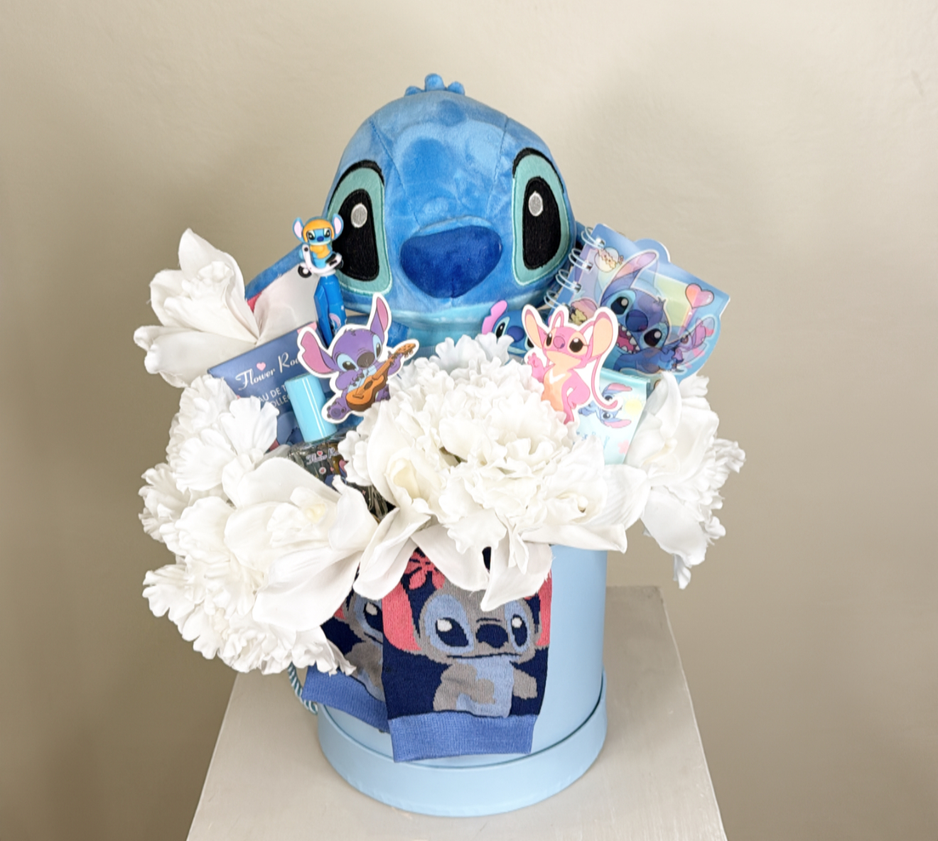بوكس بغطاء مزين بالورد الصناعي يحتوي على :دميه ستيش القطنيه .مفكره تدوين - قلم - صمغ ستيش .٢ عطر ستيش .جوارب ستيش .مناديل مبلله ستيش .شعار اكرليك حسب المناسبه .كيس وكرت اهداء خاص بالمناسبه .