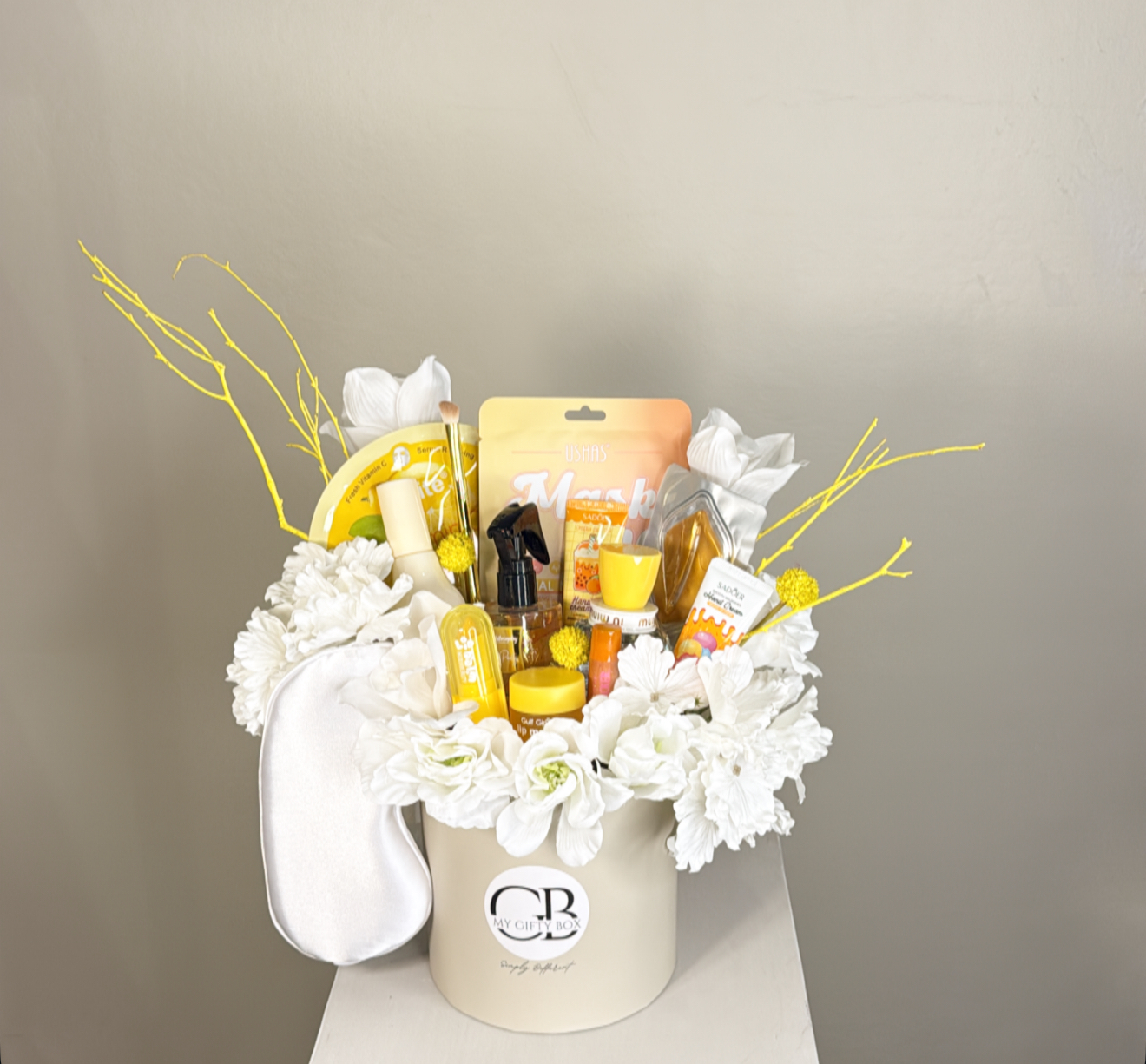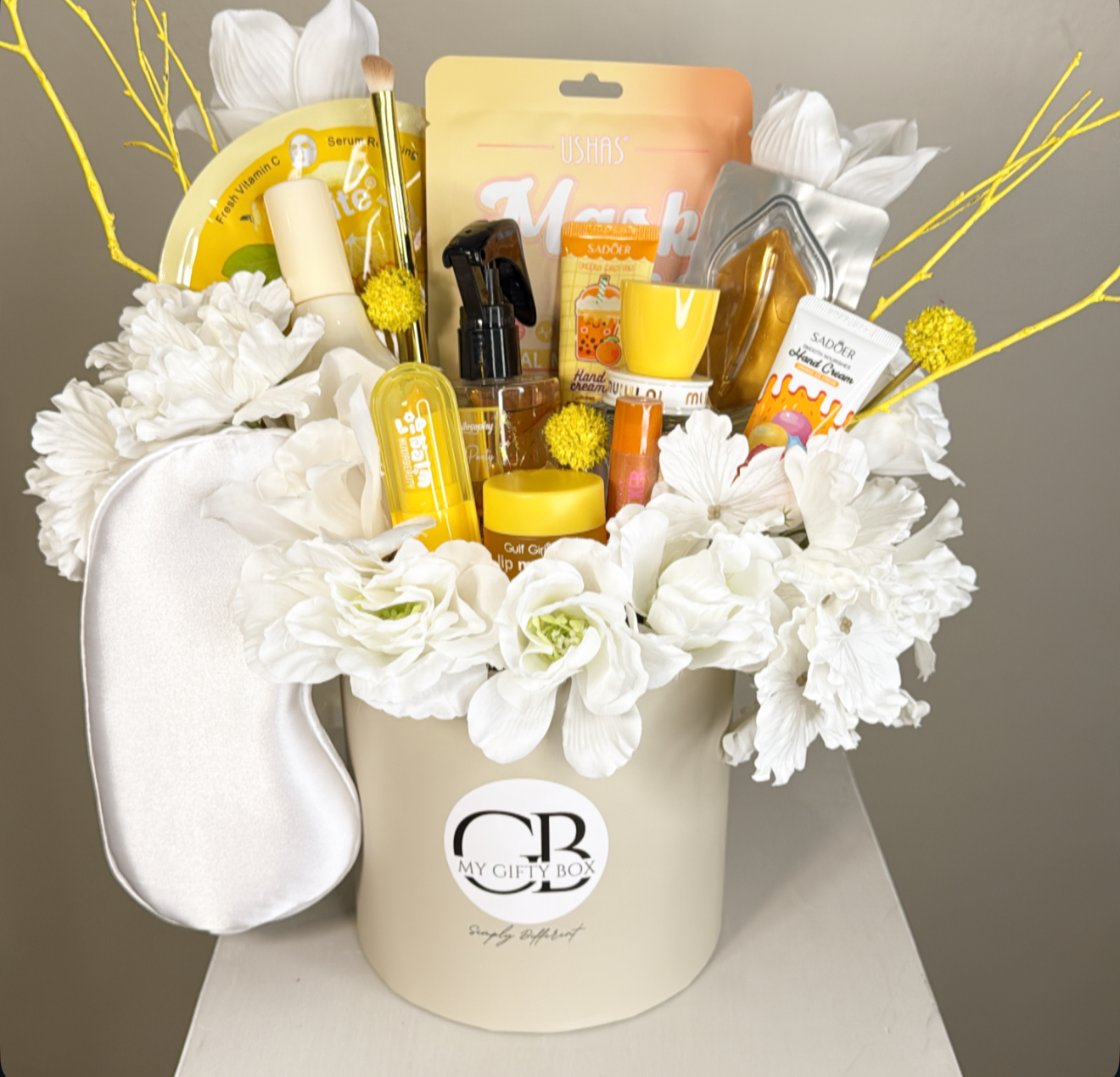 صندوق دائري مزين بالورد الصناعي .١٢ قطع متنوعه من منتجات السكن كير والعنايه الشخصيه .غطاء للعين .شعار اكرليك حسب المناسبة .كيس وكرت اهداء خاص بالمناسبه .
