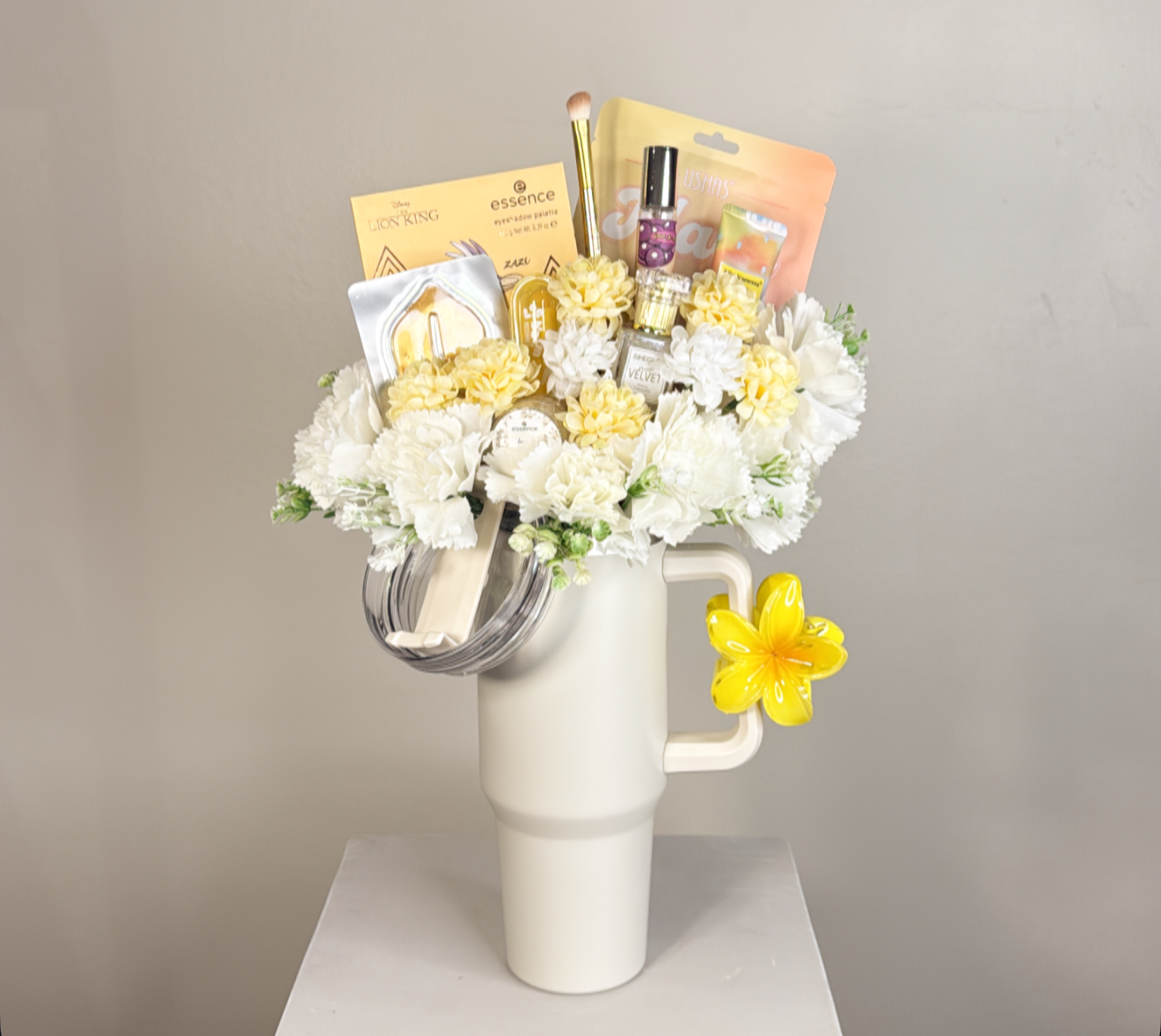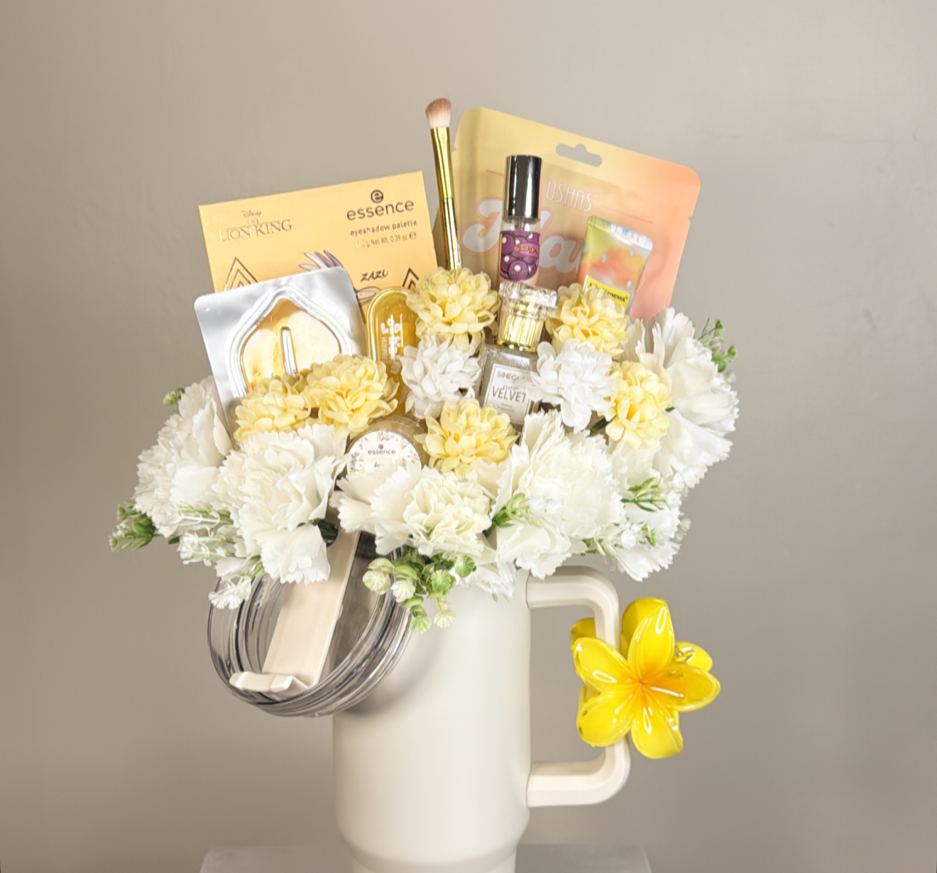 كوب حافظ للحراره بغطاء وعود ومزين بالورد الصناعي .١٠ قطع متنوعه من منتجات السكن كير والميك اب .كلبس للشعر .شعار اكرليك حسب المناسبة .كيس وكرت اهداء خاص بالمناسبه .