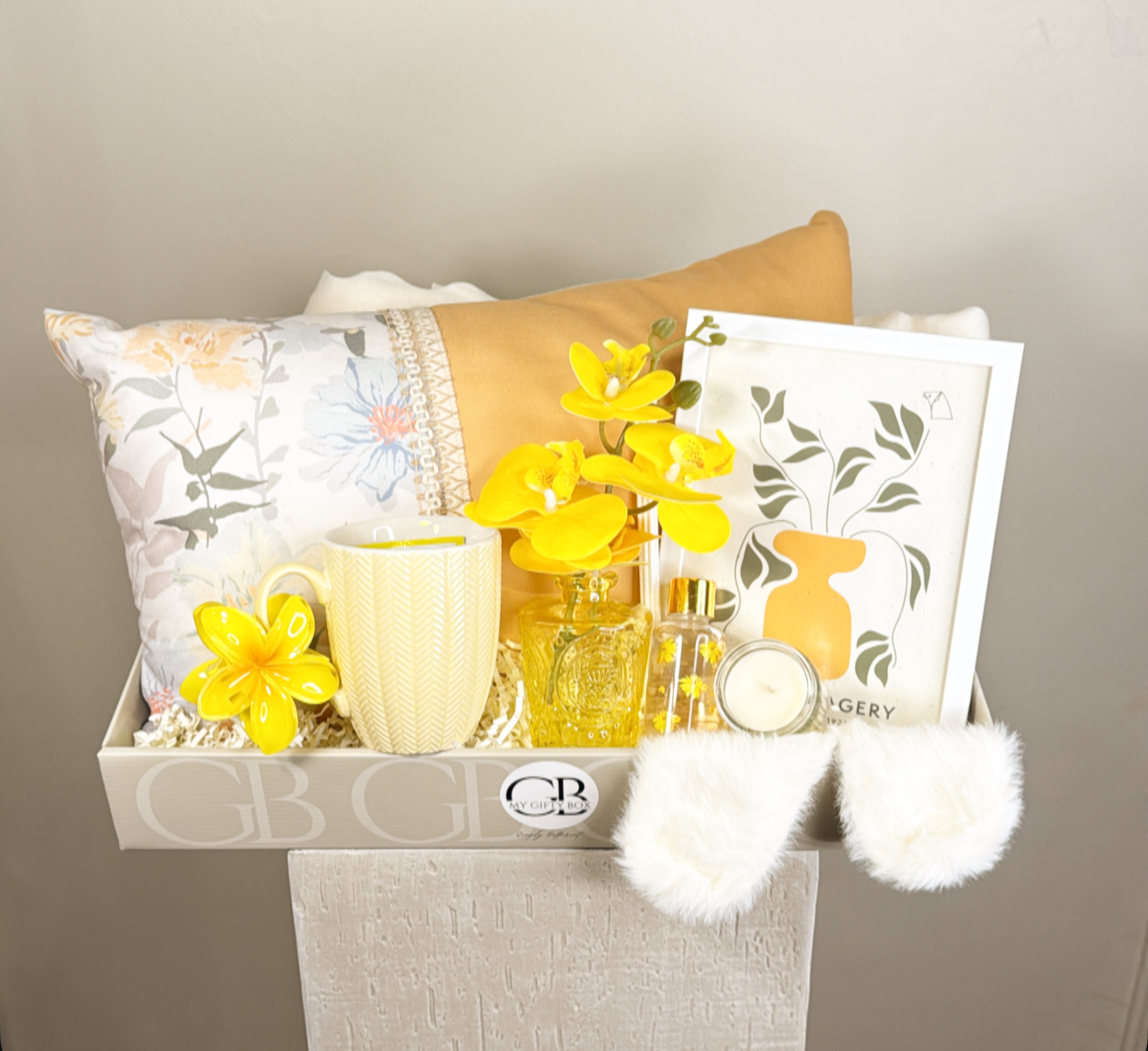 لحاف .كوشيه محشوه .لوحه .فازه اوركيد صناعي .دفيوزر معطر للجو .شمعه معطره .كوب مع شاي استرخاء .كلبس للشعر .جوارب .شعار اكرليك حسب المناسبه .كيس وكرت اهداء خاص بالمناسبه .اصل لاحبابكم مغلفه بالتور المعطر .