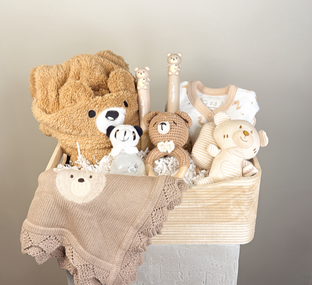 روب بيبي بقبعه .افرول بيبي .لهايه .عطر بيبي .اخاف بيبي .٢ مشط .تعليقه قطنيه .شعار اكرليك حسب المناسبه .كيس وكرت اهداء خاص بالمناسبه .تصل لاحبابكم مغلفه بالتور المعطر .