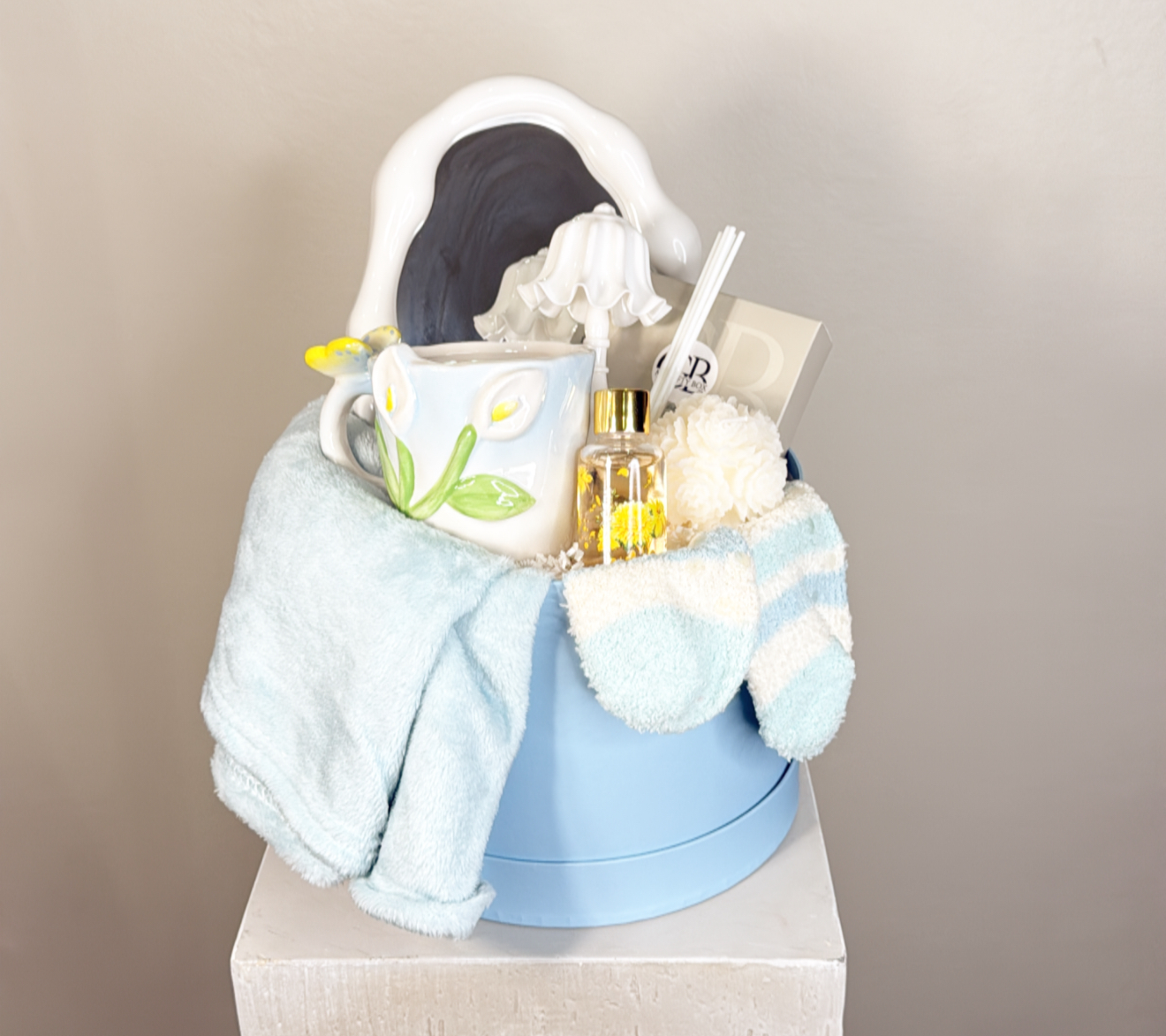 لحاف .مرايا .دفيوزر معطر للجو .كوب مع شاي استرخاء .ابجوره مضيئه تعمل بالبطاريه .علبه جوكلت بلجيكي .شمعه معطره .جوارب .شعار اكرليك حسب المناسبة .كيس وكرت اهداء خاص بالمناسبه .تصل لأحبابكم مغلفه بالتور المعطر .