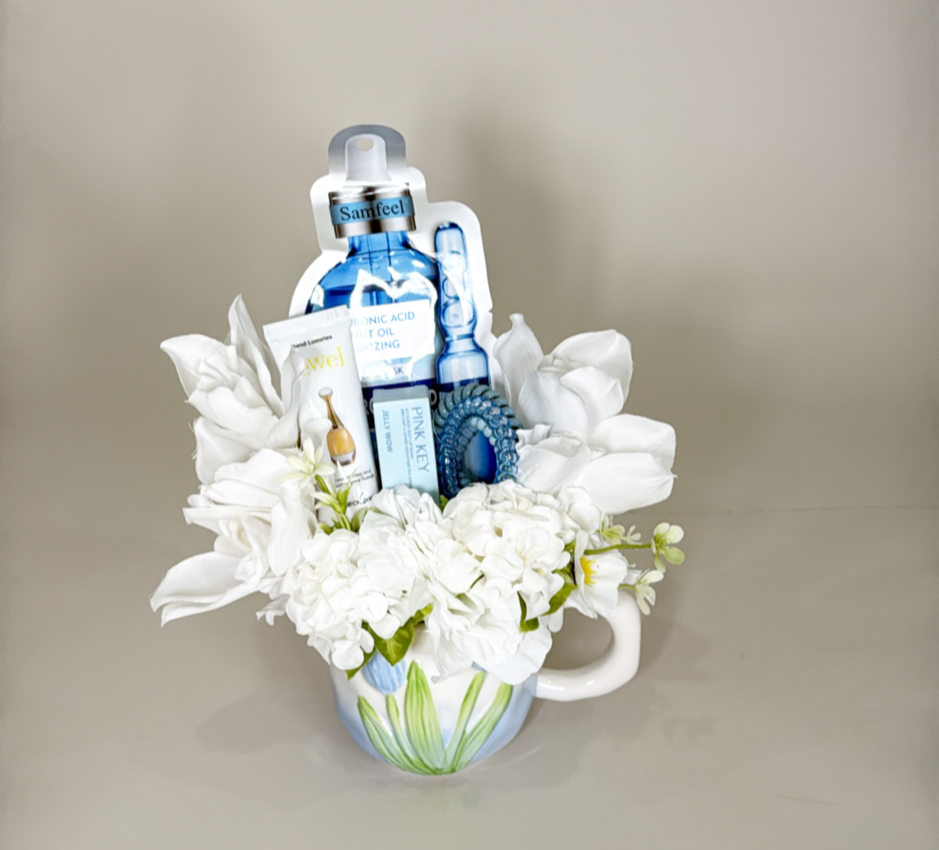 كوب مزين بالورد الصناعي .ماسك للوجه .كريم لليد .مرطب للشفاه .ربطات الشعر .شعار اكرليك حسب المناسبه .كيس وكرت اهداء خاص بالمناسبه .