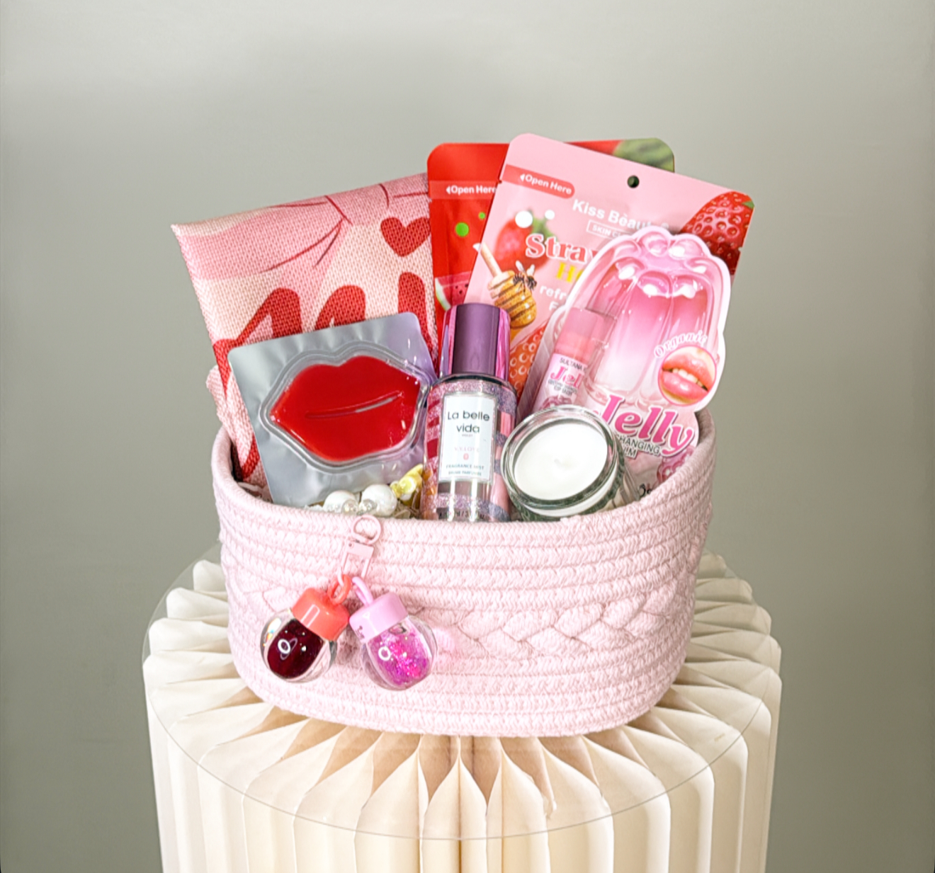 كوشيه .عطر .ماسك للشفاه .مرطب للشفاه .قلوس على شكل ميداليه .٢ ماسك للوجه .شمعه معطره .سله قابله لاعاده الاستخدام .شعار اكرليك حسب المناسبه .كيس وكرت اهداء خاص بالمناسبه .تصل لاحبابكم مغلفه بالتور المعطر .