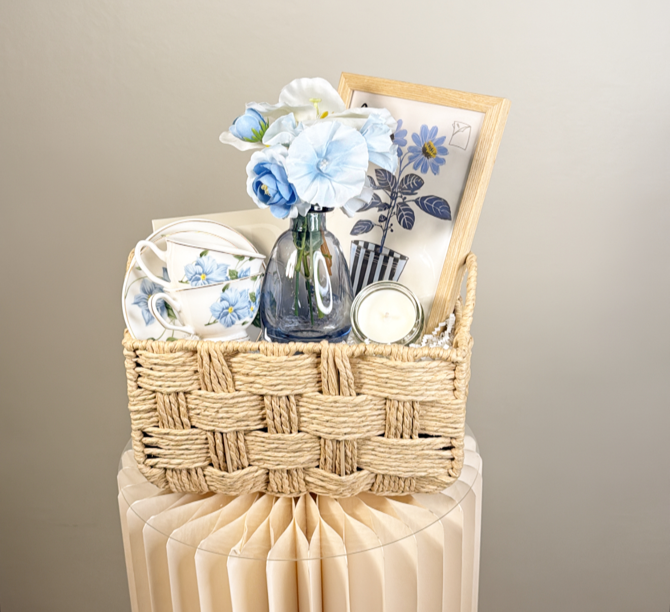 لوحه .٢ فنجان بصحن .فازه ورد صناعي .علبه جوكلت .شمعه معطره .سله قابله لاعاده الاستخدام .شعار اكرليك حسب المناسبة .كيس وكرت اهداء خاص بالمناسبه .تصل لاحبابكم مغلقه بالتور المعطر .