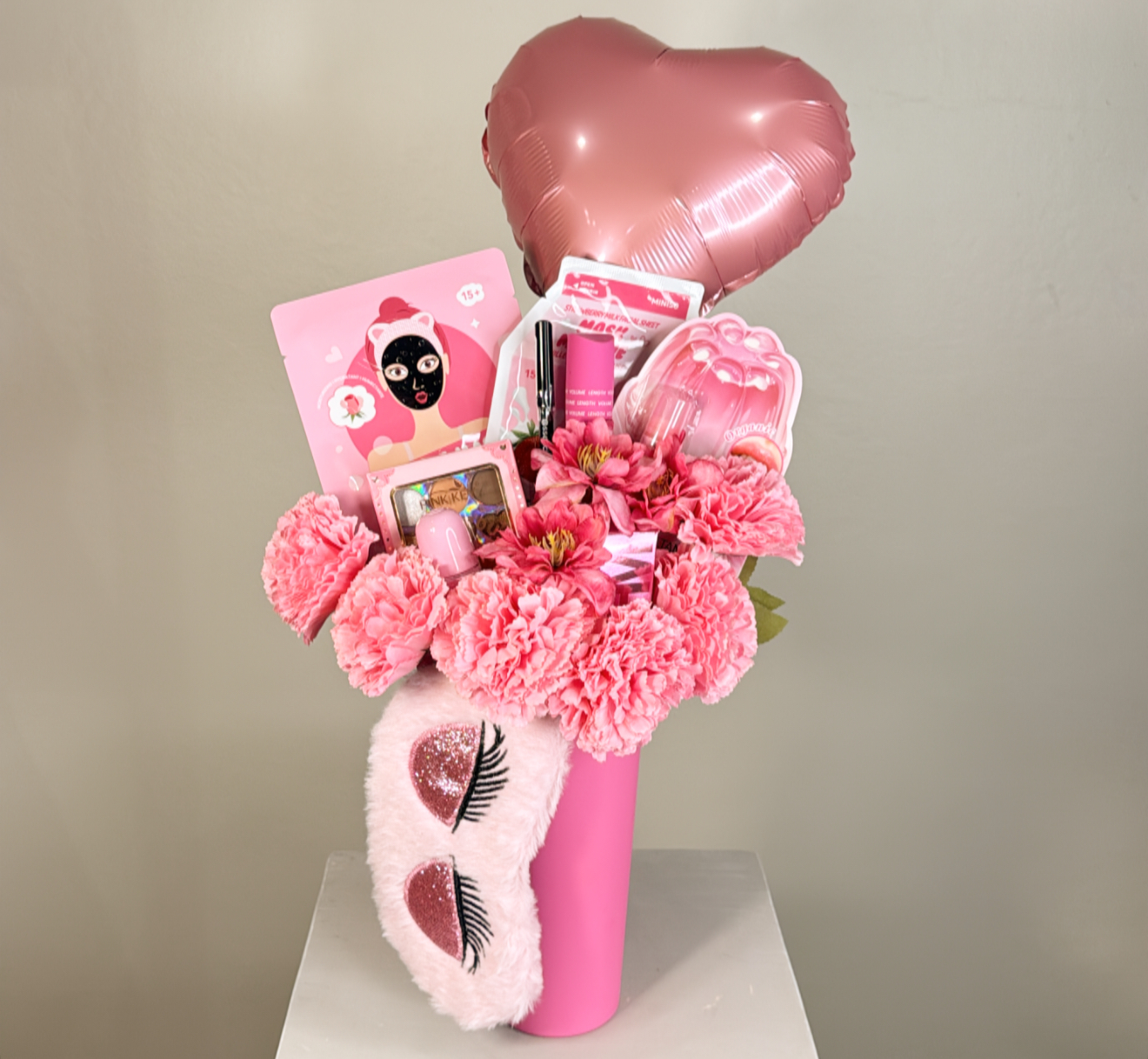 كوب بغطاء وعود ومزين بالورد الصناعي .٨ قطع متنوعه من منتجات الميك اب والسكن كير .غطاء للعين .شعار اكرليك حسب المناسبة .كيس وكرت اهداء خاص بالمناسبه .